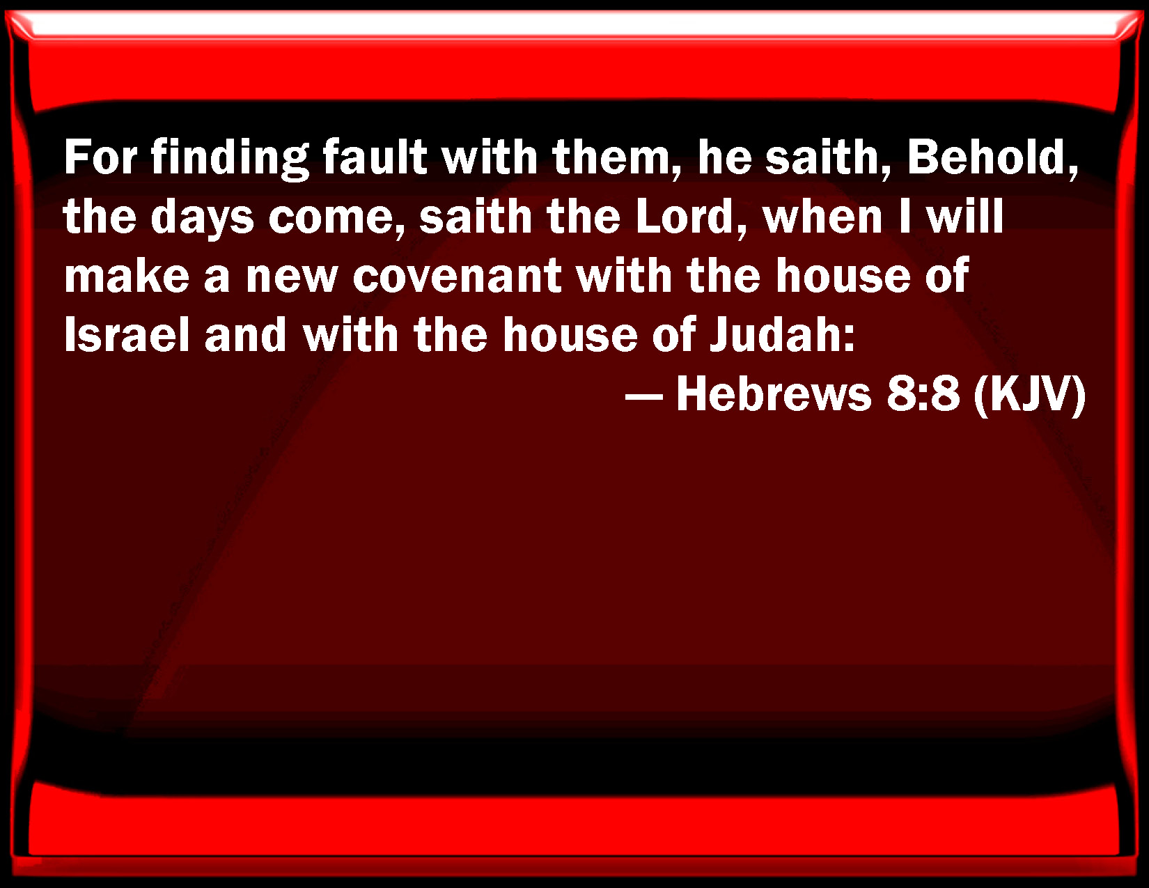 Bible Verse Slide Hebrews 8:8 For finding fault with them, he said, Behold, the days come, said the Lord, when I will make a new covenant with the house of Israel and with the house of Judah: KJV: For finding fault with them, he saith, Behold, the days come, saith the Lord, when I will make a new covenant with the house of Israel and with the house of Judah: DRB: For finding fault with them, he saith: Behold, the days shall come, saith the Lord: and I will perfect unto the house of Israel, and unto the house of Juda, a new testament: DBT: For finding fault, he says to them, Behold, days come, saith the Lord, and I will consummate a new covenant as regards the house of Israel, and as regards the house of Juda; ERV: For finding fault with them, he saith, Behold, the days come, saith the Lord, That I will make a new covenant with the house of Israel and with the house of Judah; WBT: For finding fault with them, he saith, Behold, the days come, saith the Lord, when I will make a new covenant with the house of Israel and with the house of Judah: WEB: For finding fault with them, he said, "Behold, the days come," says the Lord, "that I will make a new covenant with the house of Israel and with the house of Judah; YLT: For finding fault, He saith to them, 'Lo, days come, saith the Lord, and I will complete with the house of Israel, and with the house of Judah, a new covenant,Links Hebrews 8:8 NIV • Hebrews 8:8 NLT • Hebrews 8:8 ESV • Hebrews 8:8 NASB • Hebrews 8:8 KJV • Hebrews 8:8 Interlinear • Hebrews 8:8 Commentaries • Hebrews 8:8 Parallel Texts • Hebrews 8:8 Bible Apps • Hebrews 8:8 Parallel • Bible Hub |
