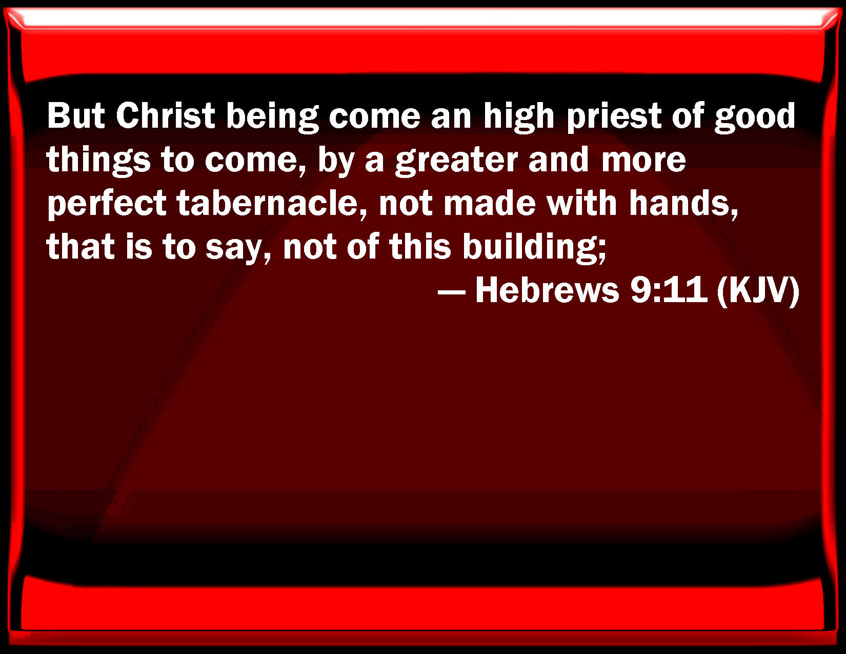 Bible Verse Slide Hebrews 9:11 But Christ being come an high priest of good things to come, by a greater and more perfect tabernacle, not made with hands, that is to say, not of this building; KJV: But Christ being come an high priest of good things to come, by a greater and more perfect tabernacle, not made with hands, that is to say, not of this building; DRB: But Christ, being come an high priest of the good things to come, by a greater and more perfect tabernacle not made with hand, that is, not of this creation: DBT: But Christ being come high priest of the good things to come, by the better and more perfect tabernacle not made with hand, (that is, not of this creation,) ERV: But Christ having come a high priest of the good things to come, through the greater and more perfect tabernacle, not made with hands, that is to say, not of this creation, WBT: But Christ being come a high priest of good things to come, by a greater and more perfect tabernacle, not made with hands, that is to say, not of this building; WEB: But Christ having come as a high priest of the coming good things, through the greater and more perfect tabernacle, not made with hands, that is to say, not of this creation, YLT: And Christ being come, chief priest of the coming good things, through the greater and more perfect tabernacle not made with hands — that is, not of this creation — Links Hebrews 9:11 NIV • Hebrews 9:11 NLT • Hebrews 9:11 ESV • Hebrews 9:11 NASB • Hebrews 9:11 KJV • Hebrews 9:11 Interlinear • Hebrews 9:11 Commentaries • Hebrews 9:11 Parallel Texts • Hebrews 9:11 Bible Apps • Hebrews 9:11 Parallel • Bible Hub |