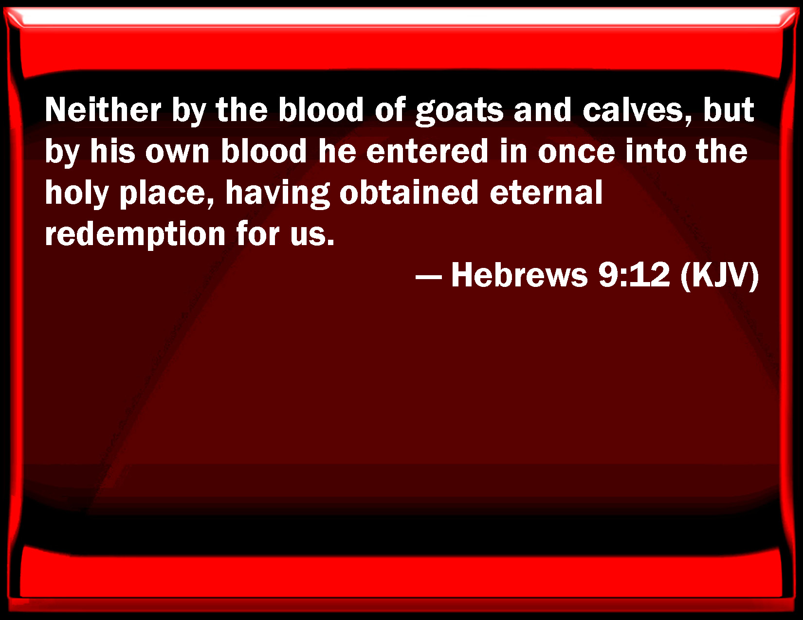 Bible Verse Slide Hebrews 9:12 Neither by the blood of goats and calves, but by his own blood he entered in once into the holy place, having obtained eternal redemption for us. KJV: Neither by the blood of goats and calves, but by his own blood he entered in once into the holy place, having obtained eternal redemption for us. DRB: Neither by the blood of goats, or of calves, but by his own blood, entered once into the holies, having obtained eternal redemption. DBT: nor by blood of goats and calves, but by his own blood, has entered in once for all into the holy of holies, having found an eternal redemption. ERV: nor yet through the blood of goats and calves, but through his own blood, entered in once for all into the holy place, having obtained eternal redemption. WBT: Neither by the blood of goats and calves, but by his own blood; he entered in once into the holy place, having obtained eternal redemption for us. WEB: nor yet through the blood of goats and calves, but through his own blood, entered in once for all into the Holy Place, having obtained eternal redemption. YLT: neither through blood of goats and calves, but through his own blood, did enter in once into the holy places, age-during redemption having obtained;Links Hebrews 9:12 NIV • Hebrews 9:12 NLT • Hebrews 9:12 ESV • Hebrews 9:12 NASB • Hebrews 9:12 KJV • Hebrews 9:12 Interlinear • Hebrews 9:12 Commentaries • Hebrews 9:12 Parallel Texts • Hebrews 9:12 Bible Apps • Hebrews 9:12 Parallel • Bible Hub |