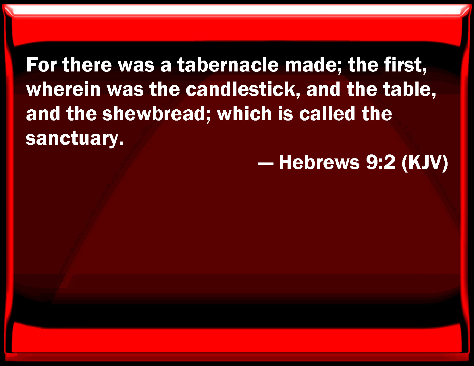 Bible Verse Slide Hebrews 9:2 For there was a tabernacle made; the first, wherein was the candlestick, and the table, and the show bread; which is called the sanctuary. KJV: For there was a tabernacle made; the first, wherein was the candlestick, and the table, and the shewbread; which is called the sanctuary. DRB: For there was a tabernacle made the first, wherein were the candlesticks, and the table, and the setting forth of loaves, which is called the holy. DBT: For a tabernacle was set up; the first, in which were both the candlestick and the table and the exposition of the loaves, which is called Holy; ERV: For there was a tabernacle prepared, the first, wherein were the candlestick, and the table, and the shewbread; which is called the Holy place. WBT: For there was a tabernacle made; the first, in which was the candlestick, and the table, and the show-bread; which is called the sanctuary. WEB: For a tabernacle was prepared. In the first part were the lampstand, the table, and the show bread; which is called the Holy Place. YLT: for a tabernacle was prepared, the first, in which was both the lamp-stand, and the table, and the bread of the presence — which is called 'Holy;'Links Hebrews 9:2 NIV • Hebrews 9:2 NLT • Hebrews 9:2 ESV • Hebrews 9:2 NASB • Hebrews 9:2 KJV • Hebrews 9:2 Interlinear • Hebrews 9:2 Commentaries • Hebrews 9:2 Parallel Texts • Hebrews 9:2 Bible Apps • Hebrews 9:2 Parallel • Bible Hub |