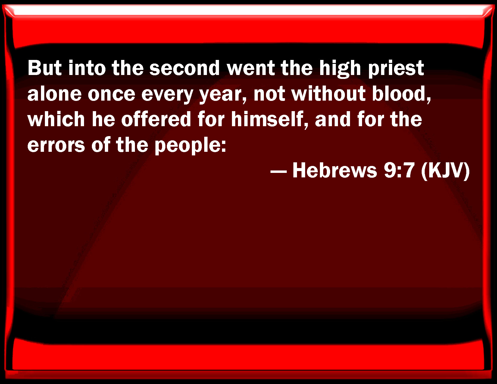 Bible Verse Slide Hebrews 9:7 But into the second went the high priest alone once every year, not without blood, which he offered for himself, and for the errors of the people: KJV: But into the second went the high priest alone once every year, not without blood, which he offered for himself, and for the errors of the people: DRB: But into the second, the high priest alone, once a year: not without blood, which he offereth for his own, and the people's ignorance: DBT: but into the second, the high priest only, once a year, not without blood, which he offers for himself and for the errors of the people: ERV: but into the second the high priest alone, once in the year, not without blood, which he offereth for himself, and for the errors of the people: WBT: But into the second went the high priest alone once every year, not without blood, which he offered for himself, and for the errors of the people: WEB: but into the second the high priest alone, once in the year, not without blood, which he offers for himself, and for the errors of the people. YLT: and into the second, once in the year, only the chief priest, not apart from blood, which he doth offer for himself and the errors of the people,Links Hebrews 9:7 NIV • Hebrews 9:7 NLT • Hebrews 9:7 ESV • Hebrews 9:7 NASB • Hebrews 9:7 KJV • Hebrews 9:7 Interlinear • Hebrews 9:7 Commentaries • Hebrews 9:7 Parallel Texts • Hebrews 9:7 Bible Apps • Hebrews 9:7 Parallel • Bible Hub |