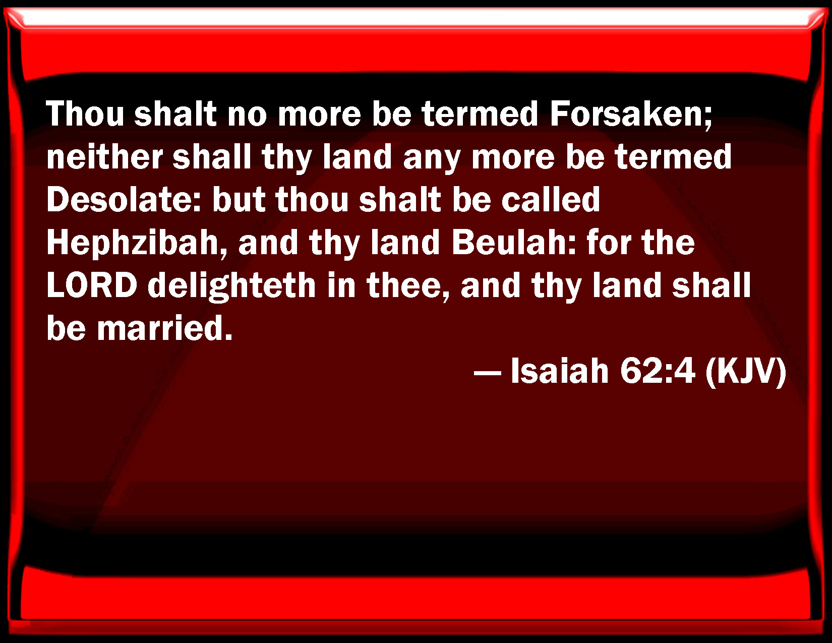 Bible Verse Slide Isaiah 62:4 You shall no more be termed Forsaken; neither shall your land any more be termed Desolate: but you shall be called Hephzibah, and your land Beulah: for the LORD delights in you, and your land shall be married. KJV: Thou shalt no more be termed Forsaken; neither shall thy land any more be termed Desolate: but thou shalt be called Hephzibah, and thy land Beulah: for the LORD delighteth in thee, and thy land shall be married. DRB: Thou shalt no more be called Forsaken: and thy land shall no more be called Desolate: but thou shalt be called My pleasure in her, and thy land inhabited. Because the Lord hath been well pleased with thee: and thy land shall be inhabited. DBT: Thou shalt no more be termed, Forsaken; neither shall thy land any more be termed, Desolate: but thou shalt be called, My delight is in her, and thy land, Married; for Jehovah delighteth in thee, and thy land shall be married. ERV: Thou shalt no more be termed Forsaken; neither shall thy land any more be termed Desolate: but thou shalt be called Hephzi-bah, and thy land Beulah: for the LORD delighteth in thee, and thy land shall be married. WBT: Thou shalt no more be termed Forsaken; neither shall thy land any more be termed Desolate: but thou shalt be called Hephzi-bah, and thy land Beulah: for the LORD delighteth in thee, and thy land shall be married. WEB: You shall no more be termed Forsaken; neither shall your land any more be termed Desolate: but you shall be called Hephzibah, and your land Beulah; for Yahweh delights in you, and your land shall be married. YLT: It is not said of thee any more, 'Forsaken!' And of thy land it is not said any more, 'Desolate,' For to thee is cried, 'My delight is in her,' And to thy land, 'Married,' For Jehovah hath delighted in thee, And thy land is married.Links Isaiah 62:4 NIV • Isaiah 62:4 NLT • Isaiah 62:4 ESV • Isaiah 62:4 NASB • Isaiah 62:4 KJV • Isaiah 62:4 Interlinear • Isaiah 62:4 Commentaries • Isaiah 62:4 Parallel Texts • Isaiah 62:4 Bible Apps • Isaiah 62:4 Parallel • Bible Hub |