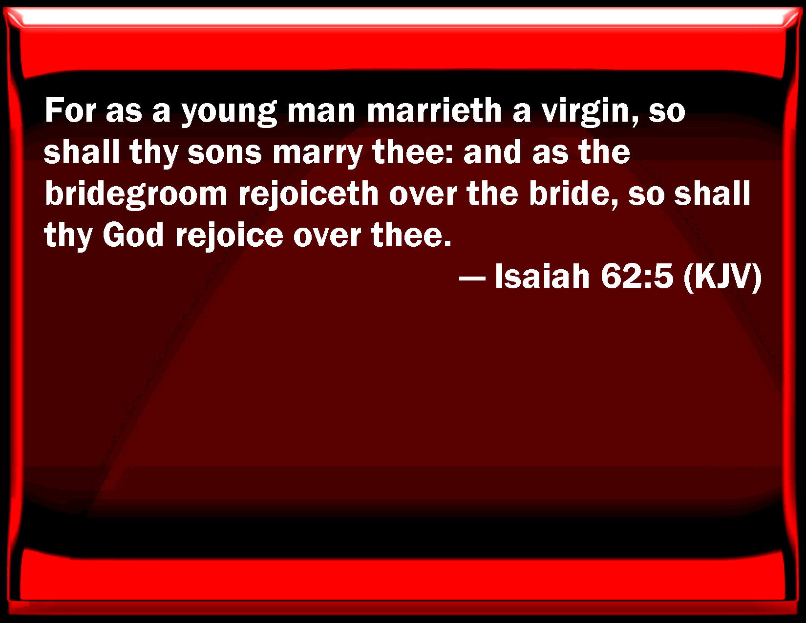 Bible Verse Slide Isaiah 62:5 For as a young man marries a virgin, so shall your sons marry you: and as the bridegroom rejoices over the bride, so shall your God rejoice over you. KJV: For as a young man marrieth a virgin, so shall thy sons marry thee: and as the bridegroom rejoiceth over the bride, so shall thy God rejoice over thee. DRB: For the young man shall dwell with the virgin, and thy children shall dwell in thee. And the bridegroom shall rejoice over the bride, and thy God shall rejoice over thee. DBT: For as a young man marrieth a virgin, shall thy sons marry thee; and with the joy of the bridegroom over the bride, shall thy God rejoice over thee. ERV: For as a young man marrieth a virgin, so shall thy sons marry thee: and as the bridegroom rejoiceth over the bride, so shall thy God rejoice over thee. WBT: For as a young man marrieth a virgin, so shall thy sons marry thee: and as the bridegroom rejoiceth over the bride, so will thy God rejoice over thee. WEB: For as a young man marries a virgin, so your sons shall marry you; and as the bridegroom rejoices over the bride, so your God will rejoice over you. YLT: For a young man doth marry a virgin, Thy Builders do marry thee, With the joy of a bridegroom over a bride, Rejoice over thee doth thy God.Links Isaiah 62:5 NIV • Isaiah 62:5 NLT • Isaiah 62:5 ESV • Isaiah 62:5 NASB • Isaiah 62:5 KJV • Isaiah 62:5 Interlinear • Isaiah 62:5 Commentaries • Isaiah 62:5 Parallel Texts • Isaiah 62:5 Bible Apps • Isaiah 62:5 Parallel • Bible Hub |