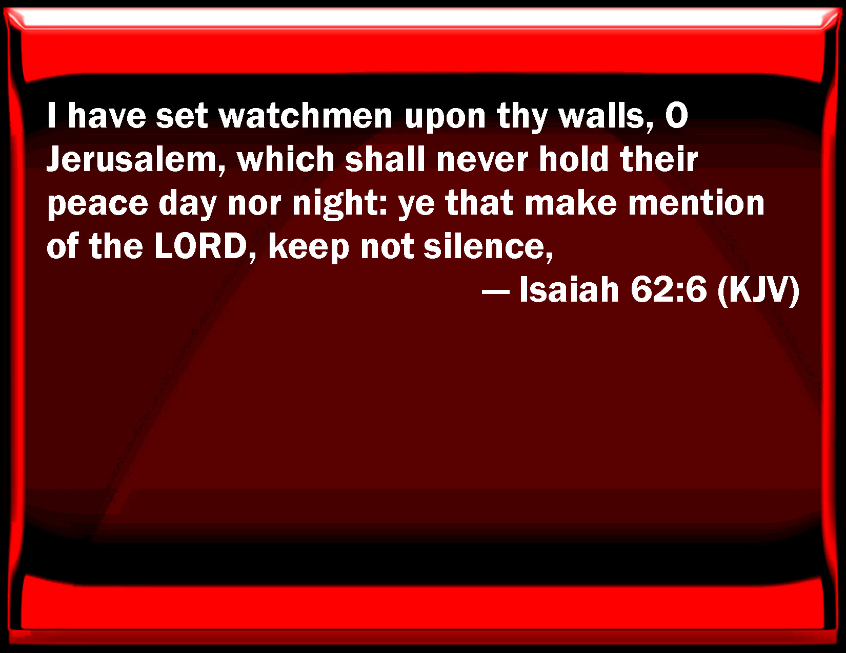 Bible Verse Slide Isaiah 62:6 I have set watchmen on your walls, O Jerusalem, which shall never hold their peace day nor night: you that make mention of the LORD, keep not silence, KJV: I have set watchmen upon thy walls, O Jerusalem, which shall never hold their peace day nor night: ye that make mention of the LORD, keep not silence, DRB: Upon thy walls, O Jerusalem, I have appointed watchmen all the day, and all the night, they shall never hold their peace. You that are mindful of the Lord, hold not your peace, DBT: I have set watchmen upon thy walls, Jerusalem; all the day and all the night they shall never hold their peace: ye that put Jehovah in remembrance, keep not silence, ERV: I have set watchmen upon thy walls, O Jerusalem; they shall never hold their peace day nor night: ye that are the LORD'S remembrancers, take ye no rest, WBT: I have set watchmen upon thy walls, O Jerusalem, which shall never hold their peace day nor night: ye that make mention of the LORD, keep not silence, WEB: I have set watchmen on your walls, Jerusalem; they shall never hold their peace day nor night: you who call on Yahweh, take no rest, YLT: 'On thy walls, O Jerusalem, I have appointed watchmen, All the day, and all the night, Continually, they are not silent.' O ye remembrancers of Jehovah, Keep not silence for yourselves,Links Isaiah 62:6 NIV • Isaiah 62:6 NLT • Isaiah 62:6 ESV • Isaiah 62:6 NASB • Isaiah 62:6 KJV • Isaiah 62:6 Interlinear • Isaiah 62:6 Commentaries • Isaiah 62:6 Parallel Texts • Isaiah 62:6 Bible Apps • Isaiah 62:6 Parallel • Bible Hub |