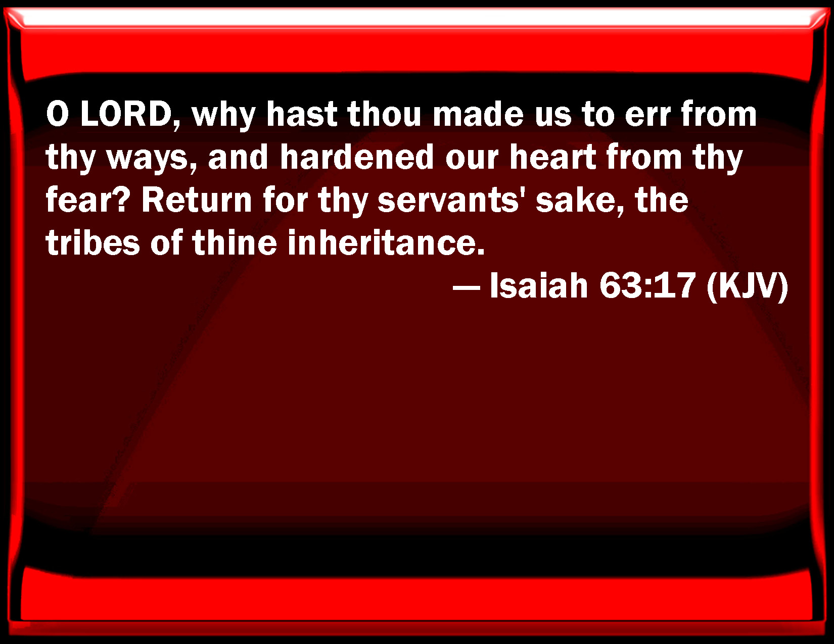Bible Verse Slide Isaiah 63:17 O LORD, why have you made us to err from your ways, and hardened our heart from your fear? Return for your servants' sake, the tribes of your inheritance. KJV: O LORD, why hast thou made us to err from thy ways, and hardened our heart from thy fear? Return for thy servants' sake, the tribes of thine inheritance. DRB: Why hast thou made us to err, O Lord, from thy ways: why hast thou hardened our heart, that we should not fear thee? return for the sake of thy servants, the tribes of thy inheritance. DBT: Why, O Jehovah, hast thou made us to err from thy ways, hast hardened our heart from thy fear? Return for thy servants' sake, the tribes of thine inheritance. ERV: O LORD, why dost thou make us to err from thy ways, and hardenest our heart from thy fear? Return for thy servants' sake, the tribes of thine inheritance. WBT: O LORD, why hast thou made us to err from thy ways, and hardened our heart from thy fear? Return for thy servants' sake, the tribes of thy inheritance. WEB: O Yahweh, why do you make us to err from your ways, and harden our heart from your fear? Return for your servants' sake, the tribes of your inheritance. YLT: Why causest Thou us to wander, O Jehovah, from Thy ways? Thou hardenest our heart from Thy fear, Turn back for Thy servants' sake, The tribes of Thine inheritance.Links Isaiah 63:17 NIV • Isaiah 63:17 NLT • Isaiah 63:17 ESV • Isaiah 63:17 NASB • Isaiah 63:17 KJV • Isaiah 63:17 Interlinear • Isaiah 63:17 Commentaries • Isaiah 63:17 Parallel Texts • Isaiah 63:17 Bible Apps • Isaiah 63:17 Parallel • Bible Hub |