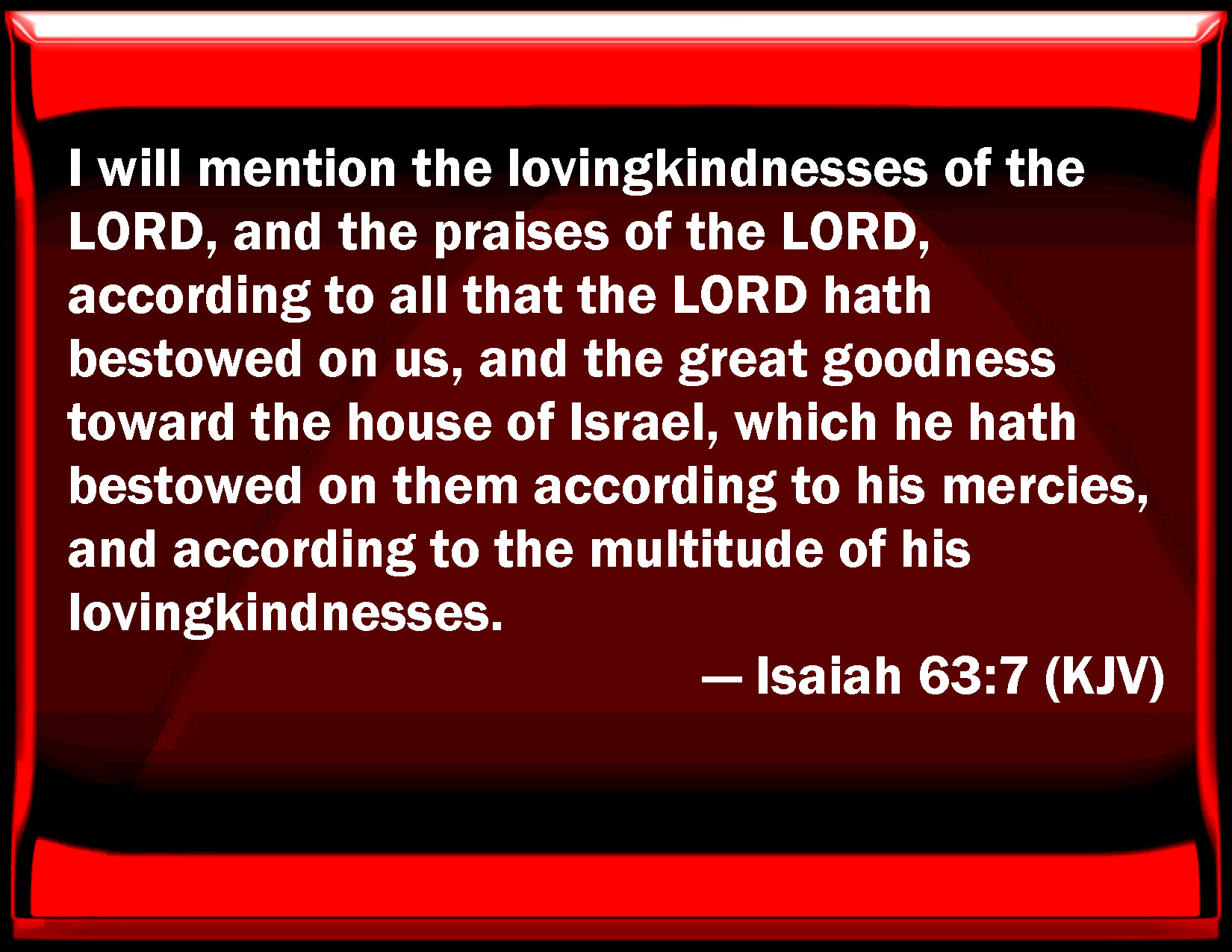 Bible Verse Slide Isaiah 63:7 I will mention the loving kindnesses of the LORD, and the praises of the LORD, according to all that the LORD has bestowed on us, and the great goodness toward the house of Israel, which he has bestowed on them according to his mercies, and according to the multitude of his loving kindnesses. KJV: I will mention the lovingkindnesses of the LORD, and the praises of the LORD, according to all that the LORD hath bestowed on us, and the great goodness toward the house of Israel, which he hath bestowed on them according to his mercies, and according to the multitude of his lovingkindnesses. DRB: I will remember the tender mercies of the Lord, the praise of the Lord for all the things that the Lord hath bestowed upon us, and for the multitude of his good things to the house of Israel, which he hath given them according to his kindness, and according to the multitude of his mercies. DBT: I will record the loving-kindnesses of Jehovah, the praises of Jehovah, according to all that Jehovah hath bestowed upon us, and the great goodness toward the house of Israel which he hath bestowed upon them according to his mercies, and according to the multitude of his loving-kindnesses. ERV: I will make mention of the lovingkindnesses of the LORD, and the praises of the LORD, according to all that the LORD hath bestowed on us; and the great goodness toward the house of Israel, which he hath bestowed on them according to his mercies, and according to the multitude of his lovingkindnesses. WBT: I will mention the loving-kindnesses of the LORD, and the praises of the LORD, according to all that the LORD hath bestowed on us, and the great goodness towards the house of Israel, which he hath bestowed on them according to his mercies, and according to the multitude of his loving-kindnesses. WEB: I will make mention of the loving kindnesses of Yahweh, [and] the praises of Yahweh, according to all that Yahweh has bestowed on us, and the great goodness toward the house of Israel, which he has bestowed on them according to his mercies, and according to the multitude of his loving kindnesses. YLT: The kind acts of Jehovah I make mention of, The praises of Jehovah, According to all that Jehovah hath done for us, And the abundance of the goodness to the house of Israel, That He hath done for them, According to His mercies, And according to the abundance of His kind acts.Links Isaiah 63:7 NIV • Isaiah 63:7 NLT • Isaiah 63:7 ESV • Isaiah 63:7 NASB • Isaiah 63:7 KJV • Isaiah 63:7 Interlinear • Isaiah 63:7 Commentaries • Isaiah 63:7 Parallel Texts • Isaiah 63:7 Bible Apps • Isaiah 63:7 Parallel • Bible Hub |