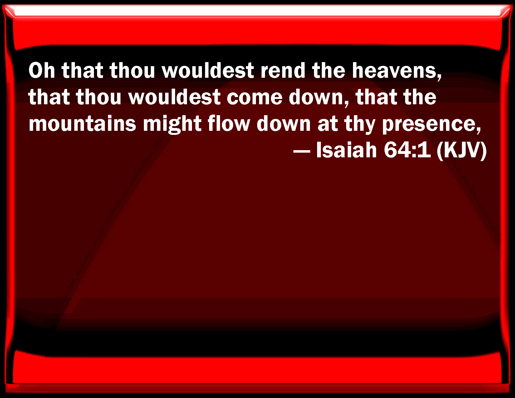 Bible Verse Slide Isaiah 64:1 Oh that you would rend the heavens, that you would come down, that the mountains might flow down at your presence, KJV: Oh that thou wouldest rend the heavens, that thou wouldest come down, that the mountains might flow down at thy presence, DRB: THAT thou wouldst rend the heavens, and wouldst come down: the mountains would melt away at thy presence. DBT: Oh, that thou wouldest rend the heavens, that thou wouldest come down, that the mountains might flow down at thy presence, ERV: Oh that thou wouldest rend the heavens, that thou wouldest come down, that the mountains might flow down at thy presence; WBT: Oh that thou wouldst rend the heavens, that thou wouldst come down, that the mountains might flow down at thy presence,\ WEB: Oh that you would tear the heavens, that you would come down, that the mountains might quake at your presence, YLT: Didst Thou not rend the heavens? Thou didst come down, From thy presence did mountains flow,Links Isaiah 64:1 NIV • Isaiah 64:1 NLT • Isaiah 64:1 ESV • Isaiah 64:1 NASB • Isaiah 64:1 KJV • Isaiah 64:1 Interlinear • Isaiah 64:1 Commentaries • Isaiah 64:1 Parallel Texts • Isaiah 64:1 Bible Apps • Isaiah 64:1 Parallel • Bible Hub |