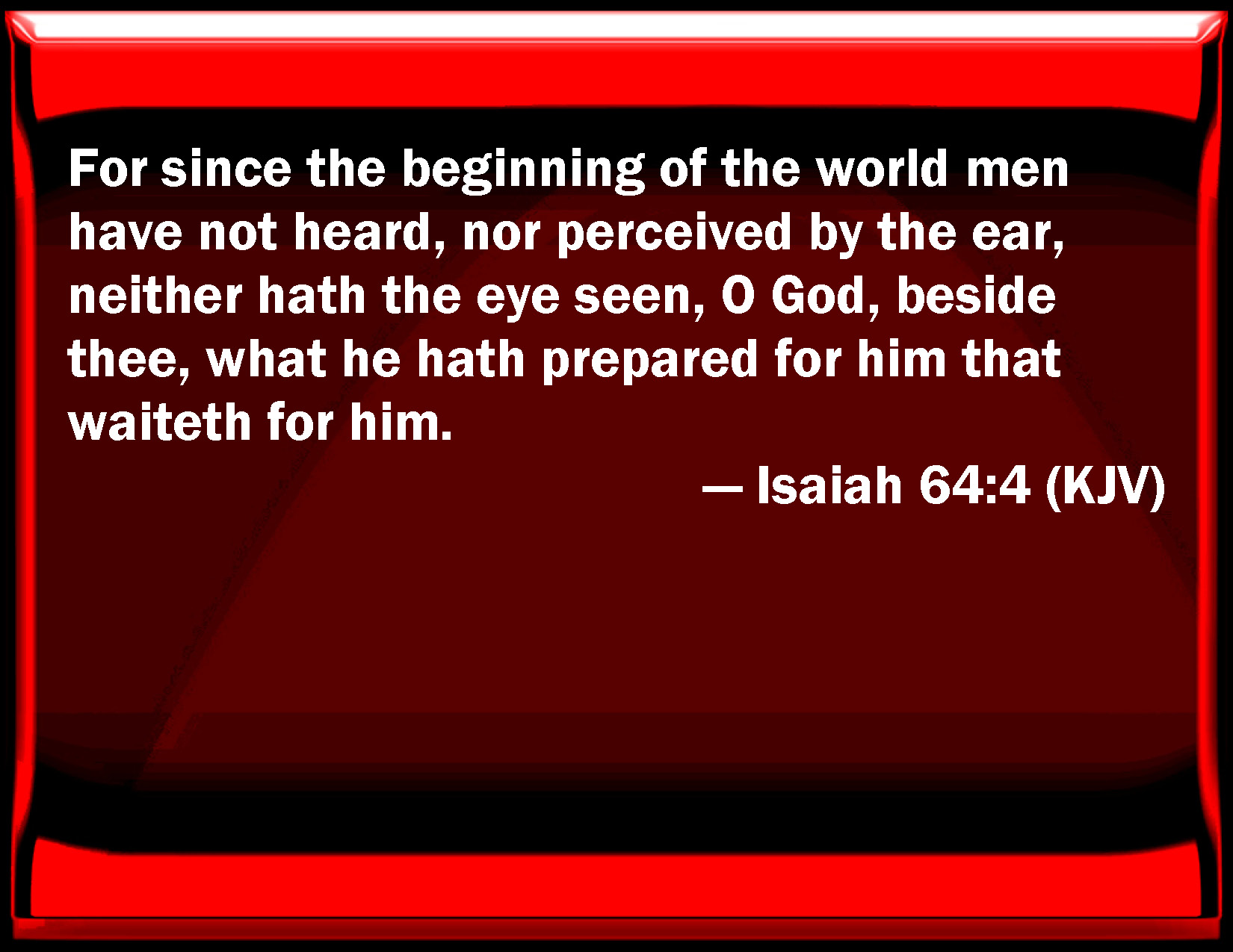 Bible Verse Slide Isaiah 64:4 For since the beginning of the world men have not heard, nor perceived by the ear, neither has the eye seen, O God, beside you, what he has prepared for him that waits for him. KJV: For since the beginning of the world men have not heard, nor perceived by the ear, neither hath the eye seen, O God, beside thee, what he hath prepared for him that waiteth for him. DRB: From the beginning of the world they have not heard, nor perceived with the ears: the eye hath not seen, O God, besides thee, what things thou hast prepared for them that wait for thee. DBT: Never have men heard, nor perceived by the ear, nor hath eye seen a God beside thee, who acteth for him that waiteth for him. ERV: For from of old men have not heard, nor perceived by the ear, neither hath the eye seen a God beside thee, which worketh for him that waiteth for him. WBT: For since the beginning of the world men have not heard, nor perceived by the ear, neither hath the eye seen, O God, besides thee, what he hath prepared for him that waiteth for him. WEB: For from of old men have not heard, nor perceived by the ear, neither has the eye seen a God besides you, who works for him who waits for him. YLT: Even from antiquity men have not heard, They have not given ear, Eye hath not seen a God save Thee, He doth work for those waiting for Him.Links Isaiah 64:4 NIV • Isaiah 64:4 NLT • Isaiah 64:4 ESV • Isaiah 64:4 NASB • Isaiah 64:4 KJV • Isaiah 64:4 Interlinear • Isaiah 64:4 Commentaries • Isaiah 64:4 Parallel Texts • Isaiah 64:4 Bible Apps • Isaiah 64:4 Parallel • Bible Hub |