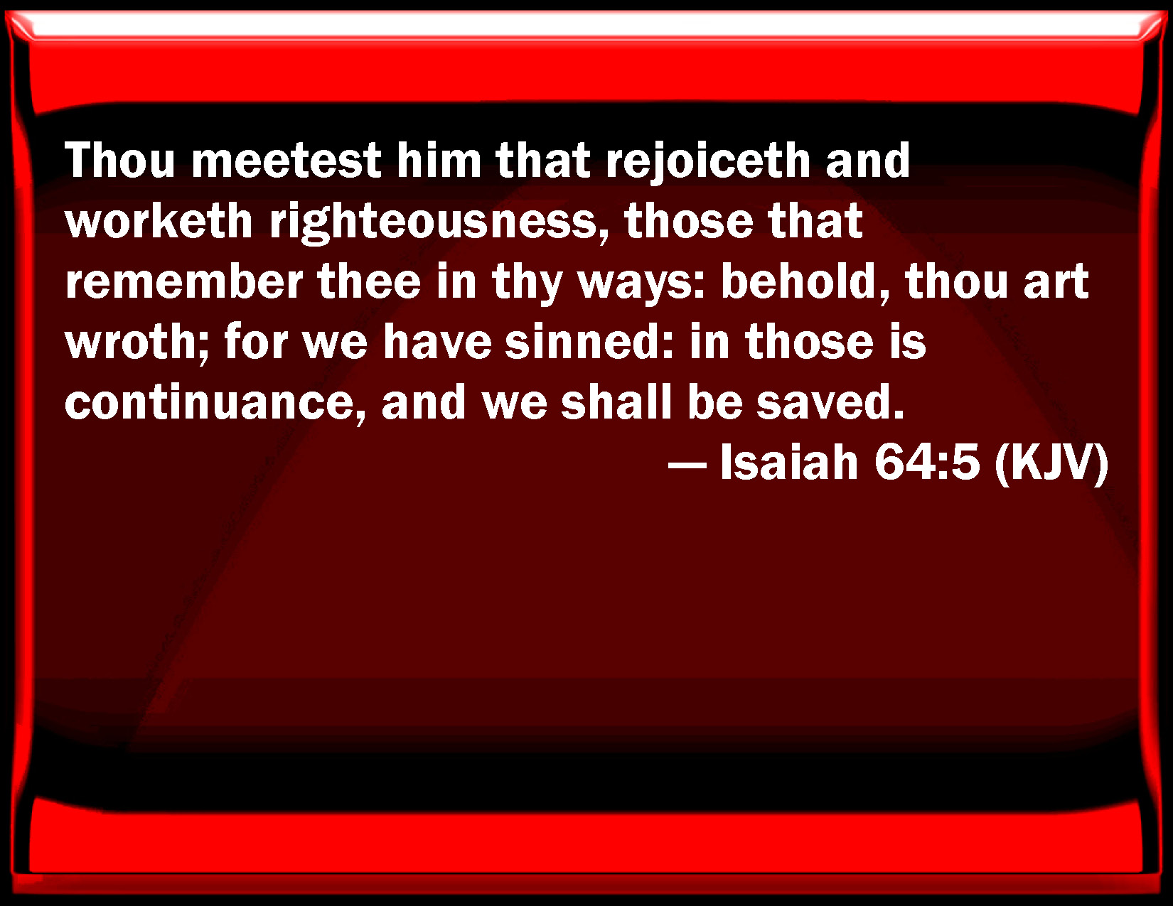Bible Verse Slide Isaiah 64:5 You meet him that rejoices and works righteousness, those that remember you in your ways: behold, you are wroth; for we have sinned: in those is continuance, and we shall be saved. KJV: Thou meetest him that rejoiceth and worketh righteousness, those that remember thee in thy ways: behold, thou art wroth; for we have sinned: in those is continuance, and we shall be saved. DRB: Thou hast met him that rejoiceth, and doth justice: in thy ways they shall remember thee: behold thou art angry, and we have sinned: in them we have been always, and we shall be saved. DBT: Thou meetest him that rejoiceth to do righteousness, those that remember thee in thy ways: (behold, thou wast wroth, and we have sinned:) in those is perpetuity, and we shall be saved. ERV: Thou meetest him that rejoiceth and worketh righteousness, those that remember thee in thy ways: behold, thou wast wroth, and we sinned: in them have we been of long time, and shall we be saved? WBT: Thou meetest him that rejoiceth, and worketh righteousness, those that remember thee in thy ways: behold, thou art wroth; for we have sinned: in those is continuance, and we shall be saved. WEB: You meet him who rejoices and works righteousness, those who remember you in your ways. Behold, you were angry, and we sinned. We have been in sin for a long time; and shall we be saved? YLT: Thou hast met with the rejoicer And the doer of righteousness, In Thy ways they remember Thee, Lo, Thou hast been wroth when we sin, By them is continuance, and we are saved.Links Isaiah 64:5 NIV • Isaiah 64:5 NLT • Isaiah 64:5 ESV • Isaiah 64:5 NASB • Isaiah 64:5 KJV • Isaiah 64:5 Interlinear • Isaiah 64:5 Commentaries • Isaiah 64:5 Parallel Texts • Isaiah 64:5 Bible Apps • Isaiah 64:5 Parallel • Bible Hub |