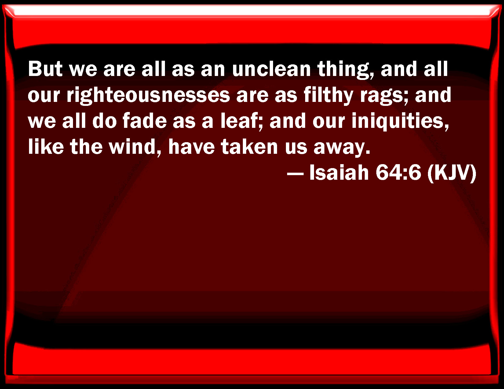 Bible Verse Slide Isaiah 64:6 But we are all as an unclean thing, and all our righteousnesses are as filthy rags; and we all do fade as a leaf; and our iniquities, like the wind, have taken us away. KJV: But we are all as an unclean thing, and all our righteousnesses are as filthy rags; and we all do fade as a leaf; and our iniquities, like the wind, have taken us away. DRB: And we are all become as one unclean, and all our justices as the rag of a menstruous woman: and we have all fallen as a leaf, and our iniquities, like the wind, have taken us away. DBT: And we are all become as an unclean thing, and all our righteousnesses are as filthy rags; and we all fade as a leaf, and our iniquities, like the wind, have carried us away; ERV: For we are all become as one that is unclean, and all our righteousnesses are as a polluted garment: and we all do fade as a leaf; and our iniquities, like the wind, take us away. WBT: But we are all as an unclean thing, and all our righteousnesses are as filthy rags; and we all do fade as a leaf; and our iniquities, like the wind, have taken us away. WEB: For we have all become as one who is unclean, and all our righteousness is as a polluted garment: and we all fade as a leaf; and our iniquities, like the wind, take us away. YLT: And we are as unclean — all of us, And as a garment passing away, all our righteous acts; And we fade as a leaf — all of us. And our iniquities as wind do take us away.Links Isaiah 64:6 NIV • Isaiah 64:6 NLT • Isaiah 64:6 ESV • Isaiah 64:6 NASB • Isaiah 64:6 KJV • Isaiah 64:6 Interlinear • Isaiah 64:6 Commentaries • Isaiah 64:6 Parallel Texts • Isaiah 64:6 Bible Apps • Isaiah 64:6 Parallel • Bible Hub |