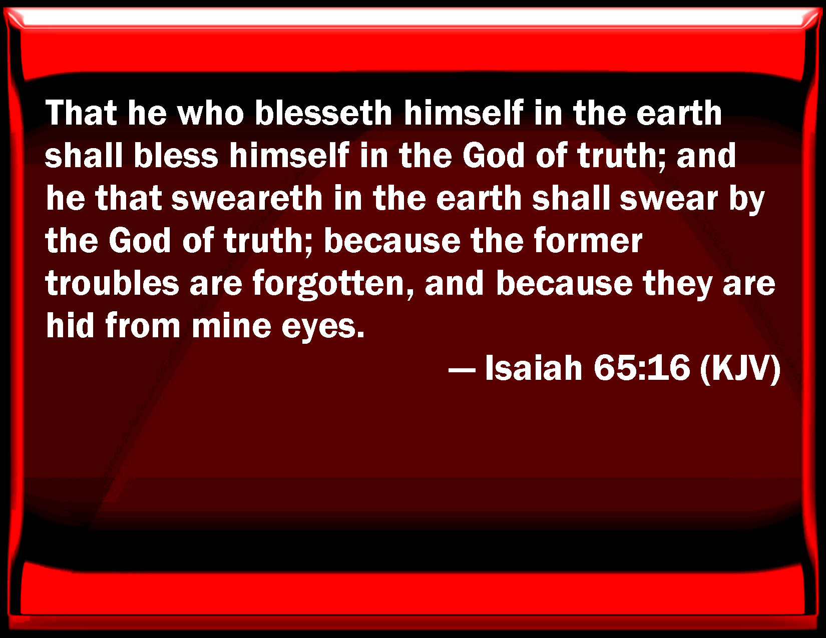 Isaiah 65:16 That he who blesses himself in the earth shall bless himself in the God of truth; and he that swears in the earth shall swear by the God of truth; because the former troubles are forgotten, and because they are hid from my eyes.
