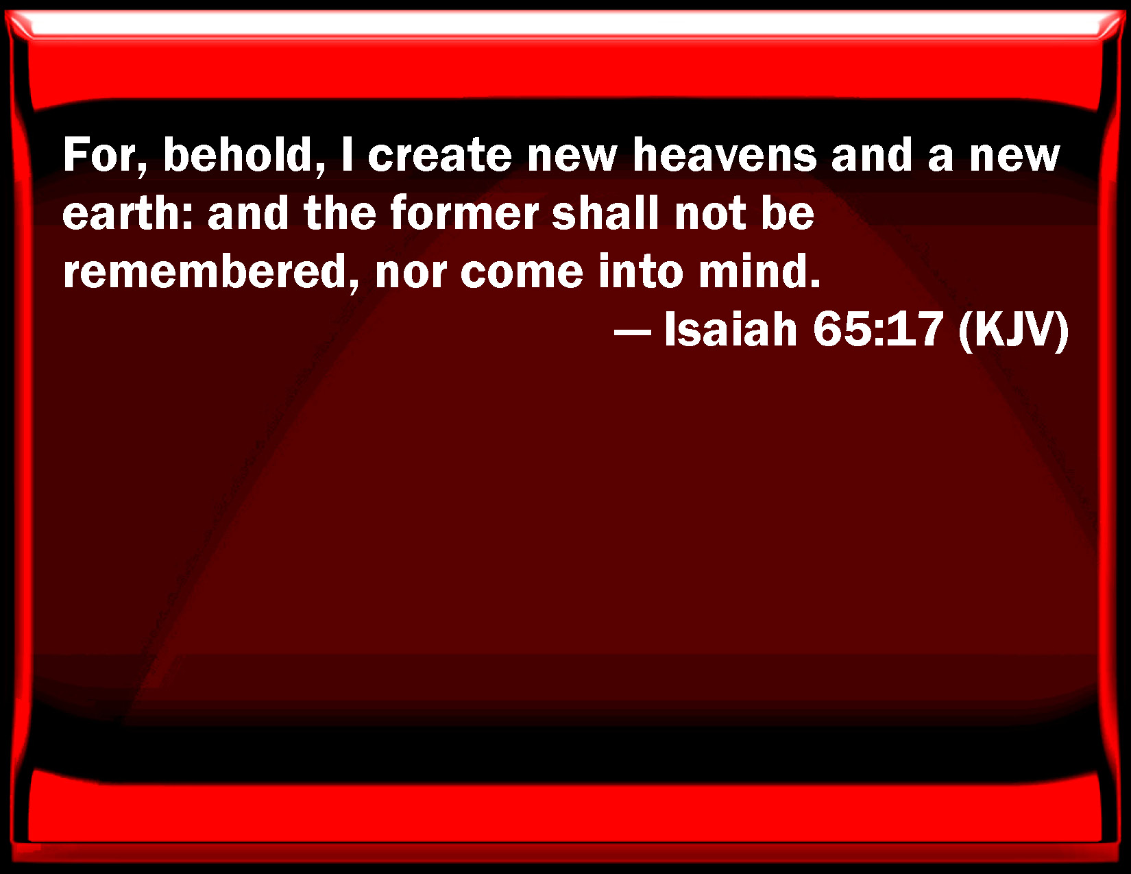 Bible Verse Slide Isaiah 65:17 For, behold, I create new heavens and a new earth: and the former shall not be remembered, nor come into mind. KJV: For, behold, I create new heavens and a new earth: and the former shall not be remembered, nor come into mind. DRB: For behold I create new heavens, and a new earth: and the former things shall not be in remembrance, and they shell not come upon the heart. DBT: For behold, I create new heavens and a new earth; and the former shall not be remembered, nor come into mind. ERV: For, behold, I create new heavens and a new earth: and the former things shall not be remembered, nor come into mind. WBT: For behold, I create new heavens and a new earth: and the former shall not be remembered, nor come into mind. WEB: "For, behold, I create new heavens and a new earth; and the former things shall not be remembered, nor come into mind. YLT: For, lo, I am creating new heavens, and a new earth, And the former things are not remembered, Nor do they ascend on the heart.Links Isaiah 65:17 NIV • Isaiah 65:17 NLT • Isaiah 65:17 ESV • Isaiah 65:17 NASB • Isaiah 65:17 KJV • Isaiah 65:17 Interlinear • Isaiah 65:17 Commentaries • Isaiah 65:17 Parallel Texts • Isaiah 65:17 Bible Apps • Isaiah 65:17 Parallel • Bible Hub |