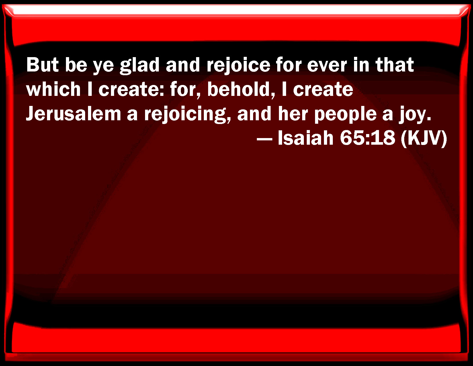 Bible Verse Slide Isaiah 65:18 But be you glad and rejoice for ever in that which I create: for, behold, I create Jerusalem a rejoicing, and her people a joy. KJV: But be ye glad and rejoice for ever in that which I create: for, behold, I create Jerusalem a rejoicing, and her people a joy. DRB: But you shall be glad and rejoice for ever in these things, which I create: for behold I create Jerusalem a rejoicing, end the people thereof joy. DBT: But be glad and rejoice for ever in that which I create. For behold, I create Jerusalem a rejoicing, and her people a joy. ERV: But be ye glad and rejoice for ever in that which I create: for, behold, I create Jerusalem a rejoicing, and her people a joy. WBT: But be ye glad and rejoice for ever in that which I create: for behold, I create Jerusalem a rejoicing, and her people a joy. WEB: But be you glad and rejoice forever in that which I create; for, behold, I create Jerusalem a rejoicing, and her people a joy. YLT: But joy ye, and rejoice for ever, that I am Creator, For, lo, I am creating Jerusalem a rejoicing, And her people a joy.Links Isaiah 65:18 NIV • Isaiah 65:18 NLT • Isaiah 65:18 ESV • Isaiah 65:18 NASB • Isaiah 65:18 KJV • Isaiah 65:18 Interlinear • Isaiah 65:18 Commentaries • Isaiah 65:18 Parallel Texts • Isaiah 65:18 Bible Apps • Isaiah 65:18 Parallel • Bible Hub |