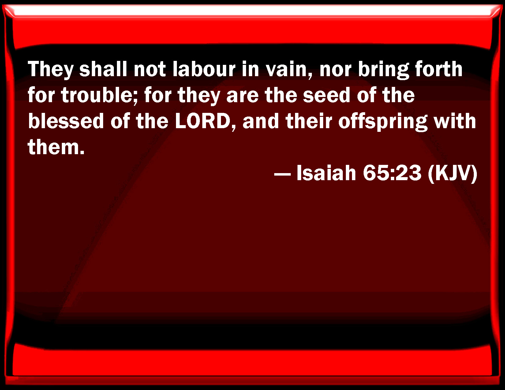 Bible Verse Slide Isaiah 65:23 They shall not labor in vain, nor bring forth for trouble; for they are the seed of the blessed of the LORD, and their offspring with them. KJV: They shall not labour in vain, nor bring forth for trouble; for they are the seed of the blessed of the LORD, and their offspring with them. DRB: My elect shall not labour in vain, nor bring forth in trouble; for they are the seed of the blessed of the Lord, and their posterity with them. DBT: They shall not labour in vain, nor bring forth for terror; for they are the seed of the blessed of Jehovah, and their offspring with them. ERV: They shall not labour in vain, nor bring forth for calamity; for they are the seed of the blessed of the LORD, and their offspring with them. WBT: They shall not labor in vain, nor bring forth for trouble; for they are the seed of the blessed of the LORD, and their offspring with them. WEB: They shall not labor in vain, nor bring forth for calamity; for they are the seed of the blessed of Yahweh, and their offspring with them. YLT: They labour not for a vain thing, Nor do they bring forth for trouble, For the seed of the blessed of Jehovah are they, And their offspring with them.Links Isaiah 65:23 NIV • Isaiah 65:23 NLT • Isaiah 65:23 ESV • Isaiah 65:23 NASB • Isaiah 65:23 KJV • Isaiah 65:23 Interlinear • Isaiah 65:23 Commentaries • Isaiah 65:23 Parallel Texts • Isaiah 65:23 Bible Apps • Isaiah 65:23 Parallel • Bible Hub |