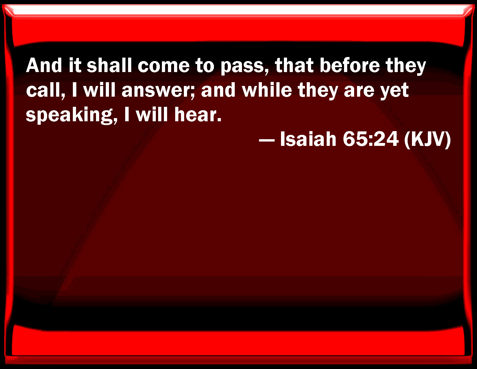 Bible Verse Slide Isaiah 65:24 And it shall come to pass, that before they call, I will answer; and while they are yet speaking, I will hear. KJV: And it shall come to pass, that before they call, I will answer; and while they are yet speaking, I will hear. DRB: And it shall come to pass, that before they call, I will hear; as they are yet speaking, I will hear. DBT: And it shall come to pass, that before they call, I will answer; while they are yet speaking, I will hear. ERV: And it shall come to pass that, before they call, I will answer; and while they are yet speaking, I will hear. WBT: And it shall come to pass, that before they call, I will answer; and while they are yet speaking, I will hear. WEB: It shall happen that, before they call, I will answer; and while they are yet speaking, I will hear. YLT: And it hath come to pass, They do not yet call, and I answer, They are yet speaking, and I hear.Links Isaiah 65:24 NIV • Isaiah 65:24 NLT • Isaiah 65:24 ESV • Isaiah 65:24 NASB • Isaiah 65:24 KJV • Isaiah 65:24 Interlinear • Isaiah 65:24 Commentaries • Isaiah 65:24 Parallel Texts • Isaiah 65:24 Bible Apps • Isaiah 65:24 Parallel • Bible Hub |