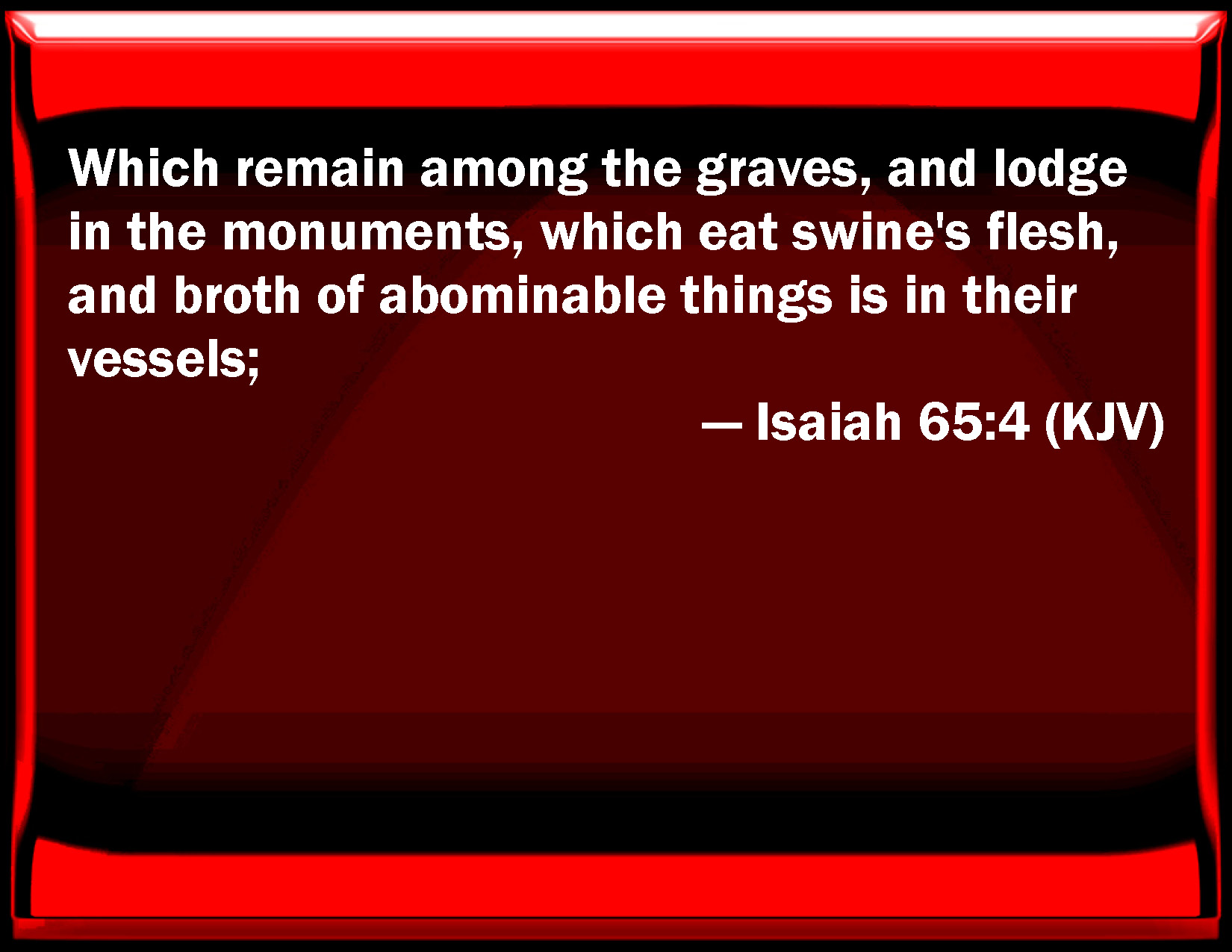 Bible Verse Slide Isaiah 65:4 Which remain among the graves, and lodge in the monuments, which eat swine's flesh, and broth of abominable things is in their vessels; KJV: Which remain among the graves, and lodge in the monuments, which eat swine's flesh, and broth of abominable things is in their vessels; DRB: That dwell in sepulchres, and sleep in the temple of idols: that eat swine's flesh, and profane broth is in their vessels. DBT: who sit down among the graves, and lodge in the secret places; who eat swine's flesh, and broth of abominable things is in their vessels; ERV: which sit among the graves, and lodge in the secret places; which eat swine's flesh, and broth of abominable things is in their vessels; WBT: Which remain among the graves, and lodge in the monuments, which eat swine's flesh, and broth of abominable things is in their vessels; WEB: who sit among the graves, and lodge in the secret places; who eat pig's flesh, and broth of abominable things is in their vessels; YLT: Who are dwelling among sepulchres, And lodge in reserved places, Who are eating flesh of the sow, And a piece of abominable things — their vessels.Links Isaiah 65:4 NIV • Isaiah 65:4 NLT • Isaiah 65:4 ESV • Isaiah 65:4 NASB • Isaiah 65:4 KJV • Isaiah 65:4 Interlinear • Isaiah 65:4 Commentaries • Isaiah 65:4 Parallel Texts • Isaiah 65:4 Bible Apps • Isaiah 65:4 Parallel • Bible Hub |