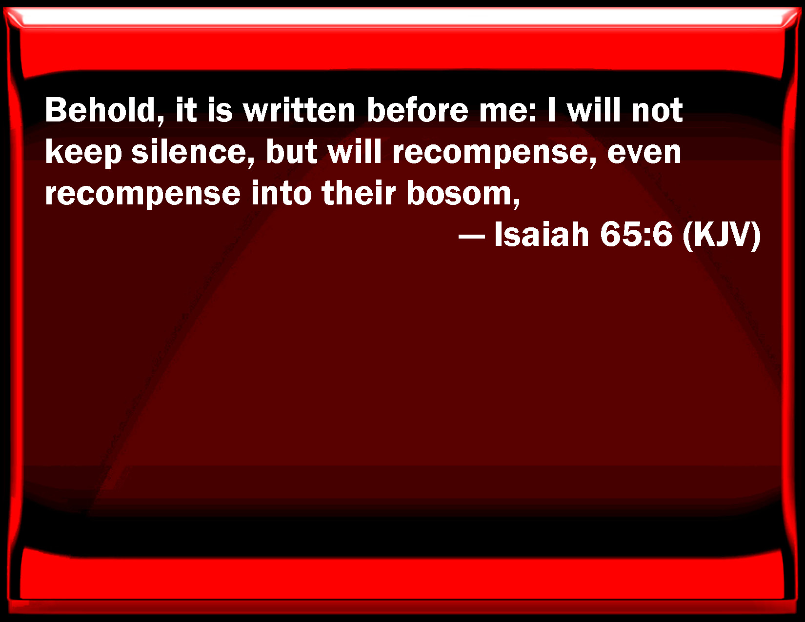 Bible Verse Slide Isaiah 65:6 Behold, it is written before me: I will not keep silence, but will recompense, even recompense into their bosom, KJV: Behold, it is written before me: I will not keep silence, but will recompense, even recompense into their bosom, DRB: Behold it is written before me: I will not be silent, but I will render and repay into their bosom. DBT: Behold, it is written before me: I will not keep silence, but will recompense, even recompense into their bosom, ERV: Behold, it is written before me: I will not keep silence, but will recompense, yea, I will recompense into their bosom, WBT: Behold, it is written before me: I will not keep silence, but will recompense, even recompense into their bosom, WEB: "Behold, it is written before me: I will not keep silence, but will recompense, yes, I will recompense into their bosom, YLT: Lo, it is written before Me: 'I am not silent, but have recompensed; And I have recompensed into their bosom,Links Isaiah 65:6 NIV • Isaiah 65:6 NLT • Isaiah 65:6 ESV • Isaiah 65:6 NASB • Isaiah 65:6 KJV • Isaiah 65:6 Interlinear • Isaiah 65:6 Commentaries • Isaiah 65:6 Parallel Texts • Isaiah 65:6 Bible Apps • Isaiah 65:6 Parallel • Bible Hub |