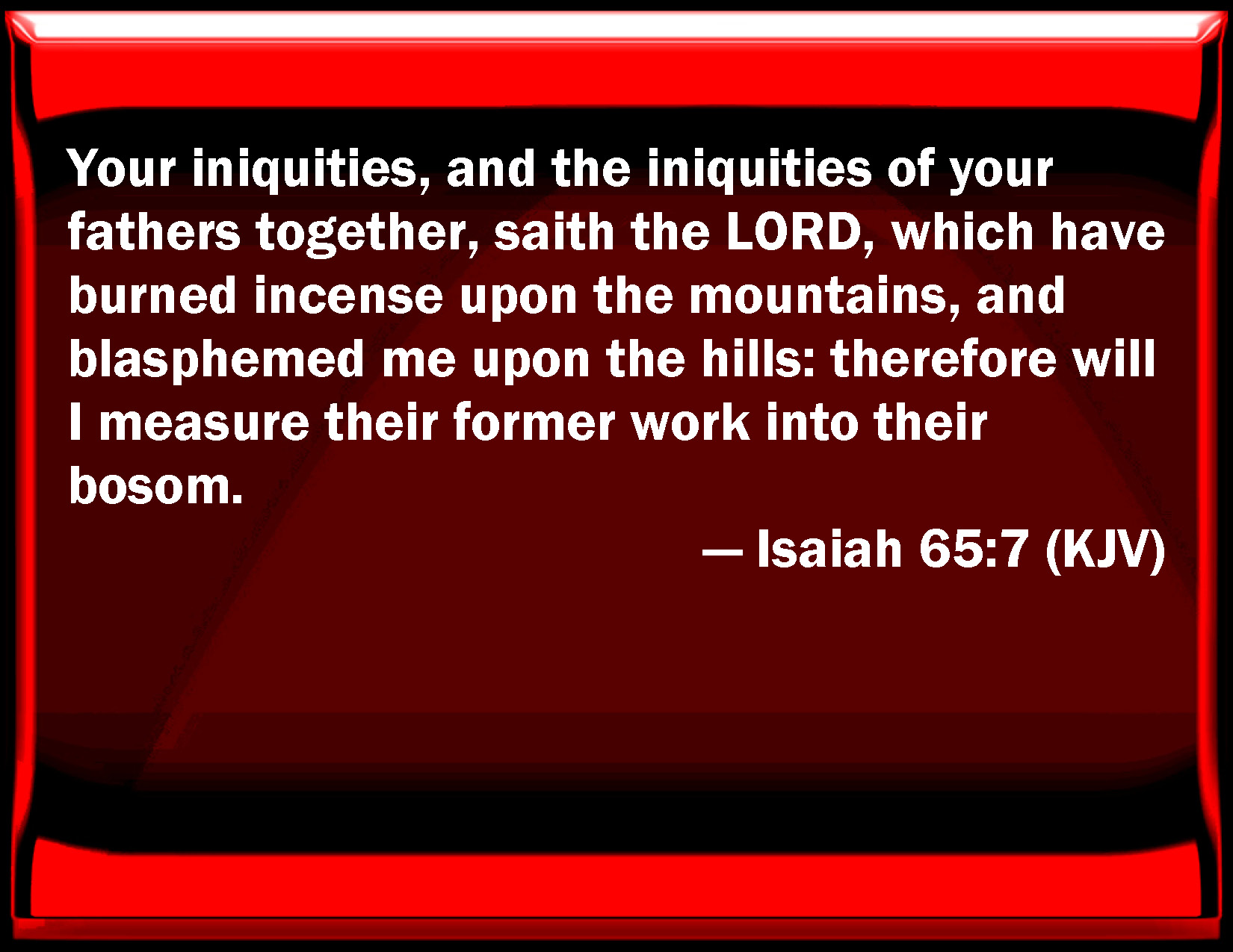 Bible Verse Slide Isaiah 65:7 Your iniquities, and the iniquities of your fathers together, said the LORD, which have burned incense on the mountains, and blasphemed me on the hills: therefore will I measure their former work into their bosom. KJV: Your iniquities, and the iniquities of your fathers together, saith the LORD, which have burned incense upon the mountains, and blasphemed me upon the hills: therefore will I measure their former work into their bosom. DRB: Your iniquities, and the iniquities of your fathers together, saith the Lord, who have sacrificed upon the mountains, and have reproached me upon the hills; and I will measure back their first work in their bosom. DBT: your iniquities, and the iniquities of your fathers together, saith Jehovah, who have burned incense upon the mountains, and outraged me upon the hills; and I will measure their former work into their bosom. ERV: your own iniquities, and the iniquities of your fathers together, saith the LORD, which have burned incense upon the mountains, and blasphemed me upon the hills: therefore will I first measure their work into their bosom. WBT: Your iniquities, and the iniquities of your fathers together, saith the LORD, who have burned incense upon the mountains, and blasphemed me upon the hills: therefore will I measure their former work into their bosom. WEB: your own iniquities, and the iniquities of your fathers together," says Yahweh, "who have burned incense on the mountains, and blasphemed me on the hills; therefore will I first measure their work into their bosom." YLT: Your iniquities, and the iniquities of your fathers together, said Jehovah, Who have made perfume on the mountains, And on the heights have reproached Me, And I have measured their former work into their bosom.'Links Isaiah 65:7 NIV • Isaiah 65:7 NLT • Isaiah 65:7 ESV • Isaiah 65:7 NASB • Isaiah 65:7 KJV • Isaiah 65:7 Interlinear • Isaiah 65:7 Commentaries • Isaiah 65:7 Parallel Texts • Isaiah 65:7 Bible Apps • Isaiah 65:7 Parallel • Bible Hub |