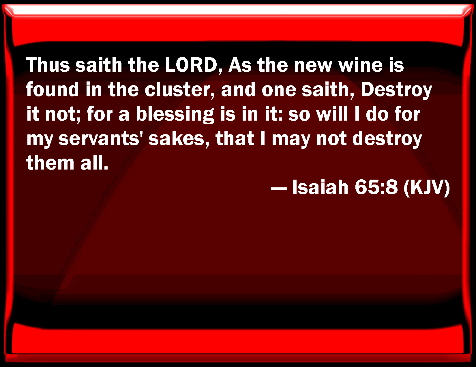 Bible Verse Slide Isaiah 65:8 Thus said the LORD, As the new wine is found in the cluster, and one said, Destroy it not; for a blessing is in it: so will I do for my servants' sakes, that I may not destroy them all. KJV: Thus saith the LORD, As the new wine is found in the cluster, and one saith, Destroy it not; for a blessing is in it: so will I do for my servants' sakes, that I may not destroy them all. DRB: Thus saith the Lord: As if a grain be found in a cluster, and it be said: Destroy it not, because it is a blessing: so will I do for the sake of my servants, that I may not destroy the whole. DBT: Thus saith Jehovah: As the new wine is found in the cluster, and it is said, Destroy it not, for a blessing is in it; so will I do for my servants' sakes, that I may not destroy them all. ERV: Thus saith the LORD, As the new wine is found in the cluster, and one saith, Destroy it not, for a blessing is in it: so will I do for my servants' sakes, that I may not destroy them all. WBT: Thus saith the LORD, As the new wine is found in the cluster, and one saith, Destroy it not; for a blessing is in it: so will I do for my servants' sake, that I may not destroy them all. WEB: Thus says Yahweh, "As the new wine is found in the cluster, and one says, 'Don't destroy it, for a blessing is in it:' so will I do for my servants' sake, that I may not destroy them all. YLT: Thus said Jehovah: As the new wine is found in the cluster, And one hath said, 'Destroy it not for a blessing is in it,' So I do for My servants' sake, not to destroy the whole.Links Isaiah 65:8 NIV • Isaiah 65:8 NLT • Isaiah 65:8 ESV • Isaiah 65:8 NASB • Isaiah 65:8 KJV • Isaiah 65:8 Interlinear • Isaiah 65:8 Commentaries • Isaiah 65:8 Parallel Texts • Isaiah 65:8 Bible Apps • Isaiah 65:8 Parallel • Bible Hub |