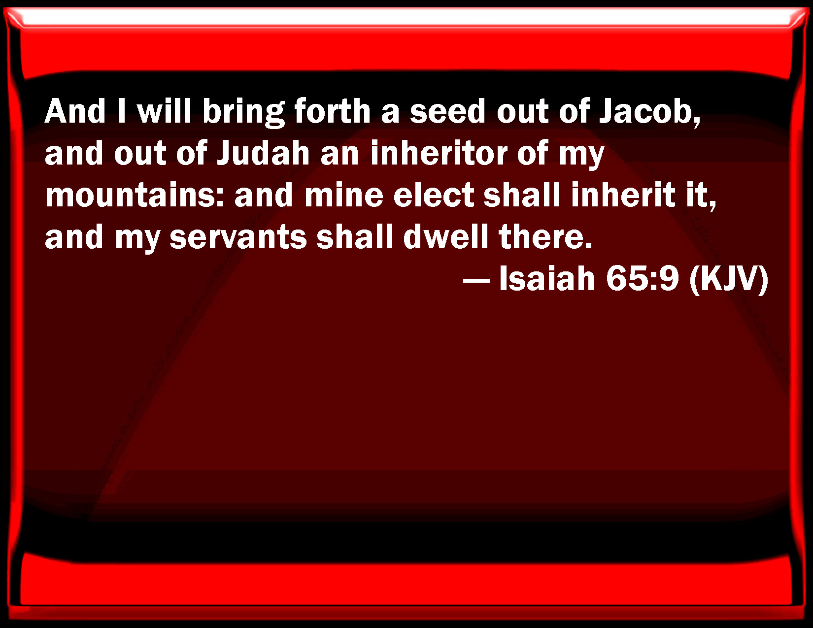 Bible Verse Slide Isaiah 65:9 And I will bring forth a seed out of Jacob, and out of Judah an inheritor of my mountains: and my elect shall inherit it, and my servants shall dwell there. KJV: And I will bring forth a seed out of Jacob, and out of Judah an inheritor of my mountains: and mine elect shall inherit it, and my servants shall dwell there. DRB: And I will bring forth a seed out of Jacob, and out of Juda a possessor of my mountains: and my elect shall inherit it, and my servants shall dwell there. DBT: And I will bring forth a seed out of Jacob, and out of Judah a possessor of my mountains; and mine elect shall possess it, and my servants shall dwell there. ERV: And I will bring forth a seed out of Jacob, and out of Judah an inheritor of my mountains: and my chosen shall inherit it, and my servants shall dwell there. WBT: And I will bring forth a seed out of Jacob, and out of Judah an inheritor of my mountains: and my elect shall inherit it, and my servants shall dwell there. WEB: I will bring forth a seed out of Jacob, and out of Judah an inheritor of my mountains; and my chosen shall inherit it, and my servants shall dwell there. YLT: And I have brought out from Jacob a seed, And from Judah a possessor of My mount, And possess it do My chosen ones, And My servants do dwell there.Links Isaiah 65:9 NIV • Isaiah 65:9 NLT • Isaiah 65:9 ESV • Isaiah 65:9 NASB • Isaiah 65:9 KJV • Isaiah 65:9 Interlinear • Isaiah 65:9 Commentaries • Isaiah 65:9 Parallel Texts • Isaiah 65:9 Bible Apps • Isaiah 65:9 Parallel • Bible Hub |