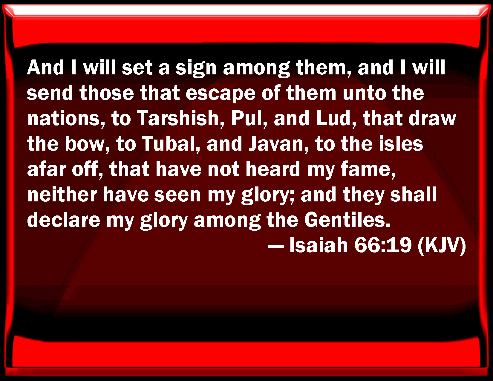 Bible Verse Slide Isaiah 66:19 And I will set a sign among them, and I will send those that escape of them to the nations, to Tarshish, Pul, and Lud, that draw the bow, to Tubal, and Javan, to the isles afar off, that have not heard my fame, neither have seen my glory; and they shall declare my glory among the Gentiles. KJV: And I will set a sign among them, and I will send those that escape of them unto the nations, to Tarshish, Pul, and Lud, that draw the bow, to Tubal, and Javan, to the isles afar off, that have not heard my fame, neither have seen my glory; and they shall declare my glory among the Gentiles. DRB: And I will set a sign among them, and I will send of them that shall be saved, to the Gentiles into the sea, into Africa, and Lydia them that draw the bow: into Italy, and Greece, to the islands afar off, to them that have not heard of me, and have not seen my glory. And they shall declare my glory to the Gentiles: DBT: And I will set a sign among them, and I will send those that escape of them unto the nations, to Tarshish, Pul, and Lud, that draw the bow; to Tubal and Javan, to the isles afar off, that have not heard my fame, neither have seen my glory: and they shall declare my glory among the nations. ERV: And I will set a sign among them, and I will send such as escape of them unto the nations, to Tarshish, Pul and Lud, that draw the bow, to Tubal and Javan, to the isles afar off, that have not heard my fame, neither have seen my glory; and they shall declare my glory among the nations. WBT: And I will set a sign among them, and I will send those that escape of them to the nations, to Tarshish, Pul, and Lud, that draw the bow, to Tubal, and Javan, to the isles afar off, that have not heard my fame, neither have seen my glory; and they shall declare my glory among the Gentiles. WEB: "I will set a sign among them, and I will send such as escape of them to the nations, to Tarshish, Pul, and Lud, who draw the bow, to Tubal and Javan, to the islands afar off, who have not heard my fame, neither have seen my glory; and they shall declare my glory among the nations. YLT: And I have set among them a sign, And have sent out of them those escaping unto the nations, (Tarshish, Pul, and Lud, drawing bow, Tubal and Javan, the isles that are far off,) Who have not heard My fame, nor seen Mine honour, And they have declared Mine honour among nations.Links Isaiah 66:19 NIV • Isaiah 66:19 NLT • Isaiah 66:19 ESV • Isaiah 66:19 NASB • Isaiah 66:19 KJV • Isaiah 66:19 Interlinear • Isaiah 66:19 Commentaries • Isaiah 66:19 Parallel Texts • Isaiah 66:19 Bible Apps • Isaiah 66:19 Parallel • Bible Hub |