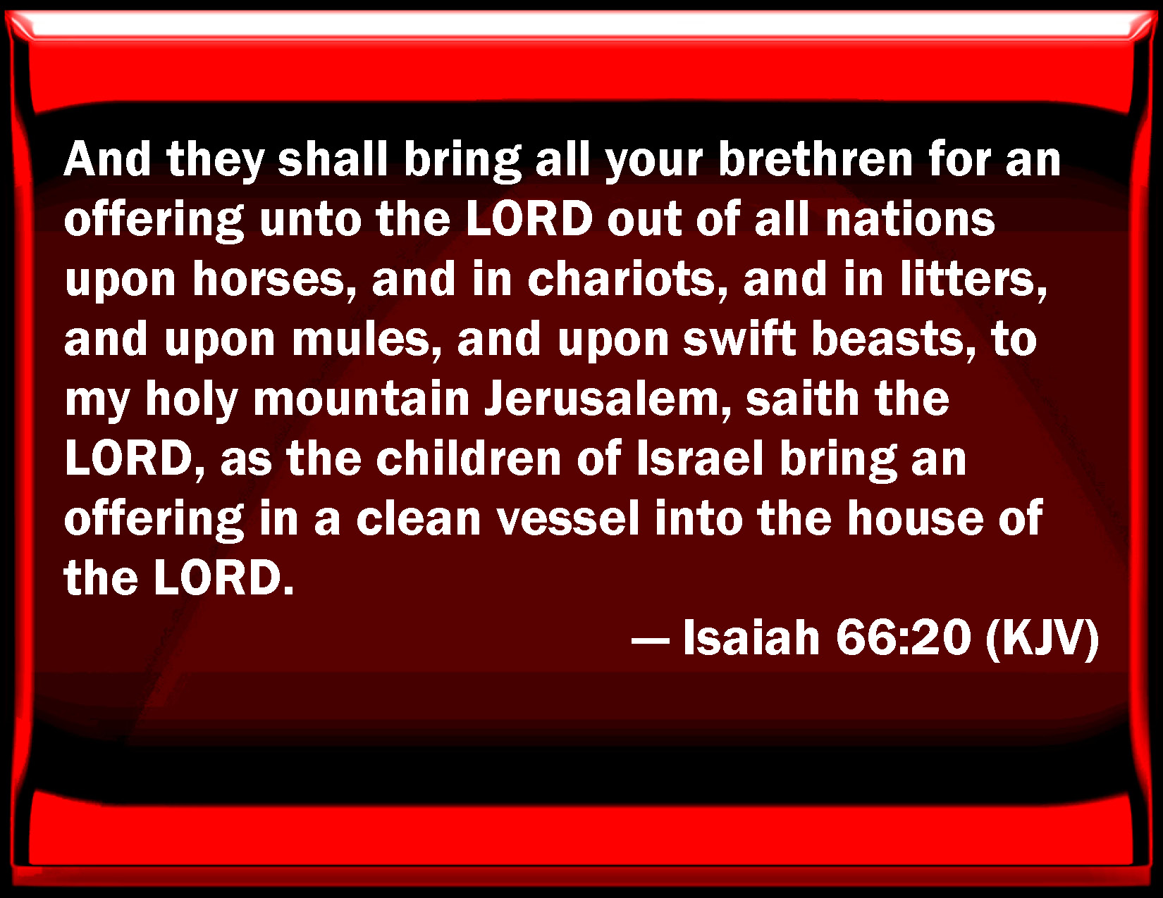 Bible Verse Slide Isaiah 66:20 And they shall bring all your brothers for an offering to the LORD out of all nations on horses, and in chariots, and in litters, and on mules, and on swift beasts, to my holy mountain Jerusalem, said the LORD, as the children of Israel bring an offering in a clean vessel into the house of the LORD. KJV: And they shall bring all your brethren for an offering unto the LORD out of all nations upon horses, and in chariots, and in litters, and upon mules, and upon swift beasts, to my holy mountain Jerusalem, saith the LORD, as the children of Israel bring an offering in a clean vessel into the house of the LORD. DRB: And they shall bring all your brethren out of all nations for a gift to the Lord, upon horses, and in chariots, and in litters, and on mules, and in coaches, to my holy mountain Jerusalem, saith the Lord, as if the children of Israel should bring an offering in a clean vessel into the house of the Lord. DBT: And they shall bring all your brethren out of all the nations as an oblation unto Jehovah, upon horses, and in chariots, and in covered waggons, and upon mules, and upon dromedaries, to my holy mountain, to Jerusalem, saith Jehovah, as the children of Israel bring an oblation in a clean vessel into the house of Jehovah. ERV: And they shall bring all your brethren out of all the nations for an offering unto the LORD, upon horses, and in chariots, and in litters, and upon mules, and upon swift beasts, to my holy mountain Jerusalem, saith the LORD, as the children of Israel bring their offering in a clean vessel into the house of the LORD. WBT: And they shall bring all your brethren for an offering to the LORD out of all nations upon horses, and in chariots, and in litters, and upon mules, and upon swift beasts, to my holy mountain Jerusalem, saith the LORD, as the children of Israel bring an offering in a clean vessel into the house of the LORD. WEB: They shall bring all your brothers out of all the nations for an offering to Yahweh, on horses, and in chariots, and in litters, and on mules, and on dromedaries, to my holy mountain Jerusalem, says Yahweh, as the children of Israel bring their offering in a clean vessel into the house of Yahweh. YLT: And they have brought all your brethren out of all the nations, A present to Jehovah, On horses, and on chariot, and on litters, And on mules, and on dromedaries, Unto My holy mountain Jerusalem, said Jehovah, As the sons of Israel bring the present in a clean vessel, Into the house of Jehovah.Links Isaiah 66:20 NIV • Isaiah 66:20 NLT • Isaiah 66:20 ESV • Isaiah 66:20 NASB • Isaiah 66:20 KJV • Isaiah 66:20 Interlinear • Isaiah 66:20 Commentaries • Isaiah 66:20 Parallel Texts • Isaiah 66:20 Bible Apps • Isaiah 66:20 Parallel • Bible Hub |