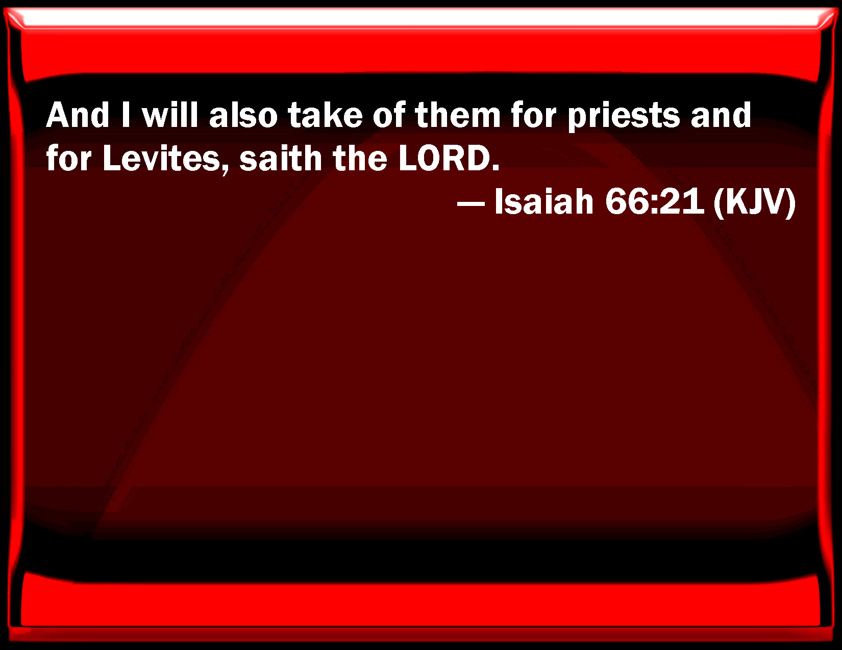 Bible Verse Slide Isaiah 66:21 And I will also take of them for priests and for Levites, said the LORD. KJV: And I will also take of them for priests and for Levites, saith the LORD. DRB: And I will take of them to be priests, and Levites, saith the Lord. DBT: And I will also take of them for priests and for Levites, saith Jehovah. ERV: And of them also will I take for priests and for Levites, saith the LORD. WBT: And I will also take of them for priests and for Levites, saith the LORD. WEB: Of them also will I take for priests [and] for Levites," says Yahweh. YLT: And also of them I take for priests, For Levites, said Jehovah.Links Isaiah 66:21 NIV • Isaiah 66:21 NLT • Isaiah 66:21 ESV • Isaiah 66:21 NASB • Isaiah 66:21 KJV • Isaiah 66:21 Interlinear • Isaiah 66:21 Commentaries • Isaiah 66:21 Parallel Texts • Isaiah 66:21 Bible Apps • Isaiah 66:21 Parallel • Bible Hub |