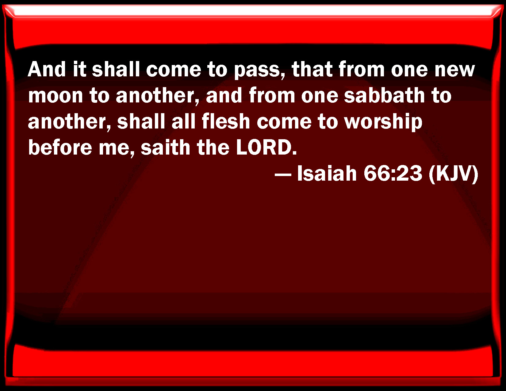 Bible Verse Slide Isaiah 66:23 And it shall come to pass, that from one new moon to another, and from one sabbath to another, shall all flesh come to worship before me, said the LORD. KJV: And it shall come to pass, that from one new moon to another, and from one sabbath to another, shall all flesh come to worship before me, saith the LORD. DRB: And there shall be month after month, and sabbath after sabbath: and all flesh shall come to adore before my face, saith the Lord. DBT: And it shall come to pass from new moon to new moon, and from sabbath to sabbath, all flesh shall come to worship before me, saith Jehovah. ERV: And it shall come to pass, that from one new moon to another, and from one sabbath to another, shall all flesh come to worship before me, saith the LORD. WBT: And it shall come to pass, that from one new moon to another, and from one sabbath to another, shall all flesh come to worship before me, saith the LORD. WEB: It shall happen, that from one new moon to another, and from one Sabbath to another, shall all flesh come to worship before me," says Yahweh. YLT: And it hath been from month to month, And from sabbath to sabbath, Come do all flesh to bow themselves before Me, Said Jehovah.Links Isaiah 66:23 NIV • Isaiah 66:23 NLT • Isaiah 66:23 ESV • Isaiah 66:23 NASB • Isaiah 66:23 KJV • Isaiah 66:23 Interlinear • Isaiah 66:23 Commentaries • Isaiah 66:23 Parallel Texts • Isaiah 66:23 Bible Apps • Isaiah 66:23 Parallel • Bible Hub |