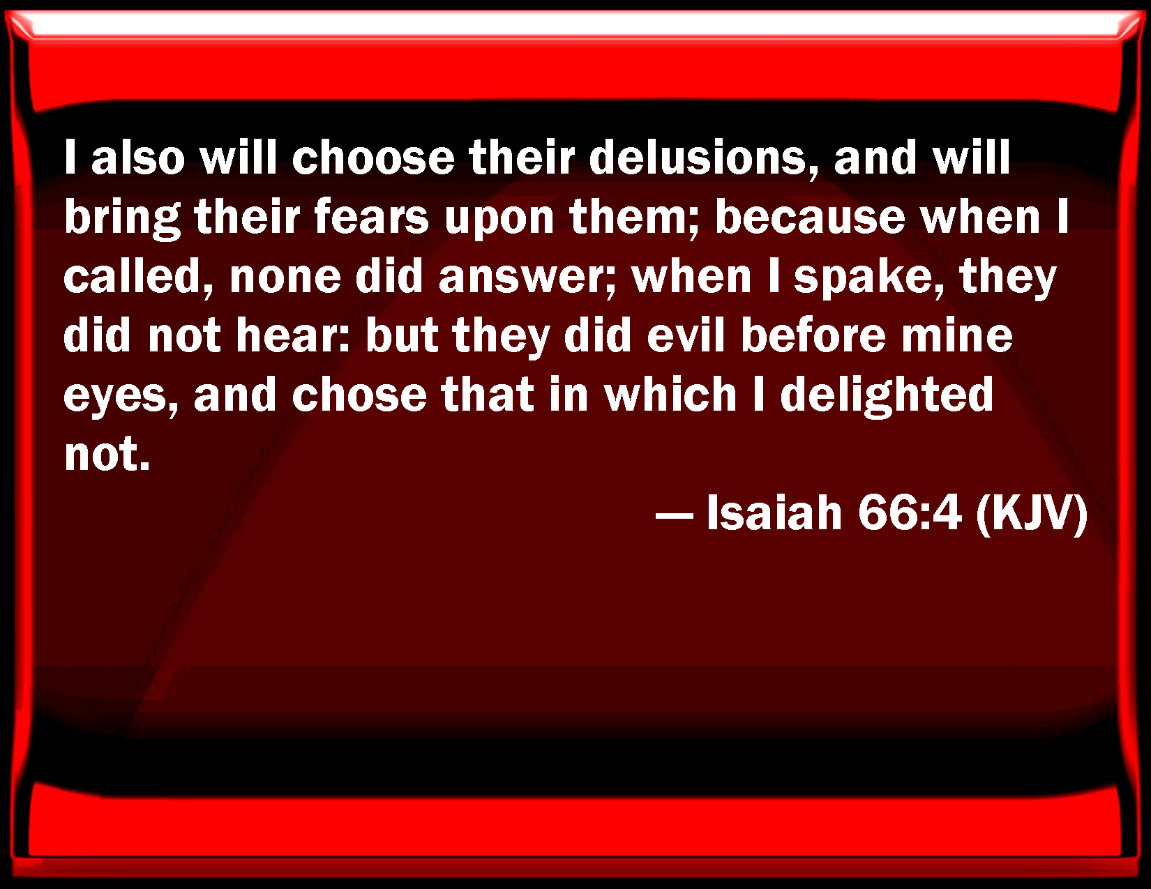 Bible Verse Slide Isaiah 66:4 I also will choose their delusions, and will bring their fears on them; because when I called, none did answer; when I spoke, they did not hear: but they did evil before my eyes, and chose that in which I delighted not. KJV: I also will choose their delusions, and will bring their fears upon them; because when I called, none did answer; when I spake, they did not hear: but they did evil before mine eyes, and chose that in which I delighted not. DRB: Wherefore I also will choose their mockeries, and will bring upon them the things they feared: y because I called, and there was none that would answer; I have spoken, and they heard not; and they have done evil in my eyes, and have chosen the things that displease me. DBT: I also will choose their calamities, and will bring their fears upon them; because I called, and none answered, I spoke, and they did not hear, but did that which was evil in mine eyes, and chose that wherein I delight not. ERV: I also will choose their delusions, and will bring their fears upon them; because when I called, none did answer; when I spake, they did not hear: but they did that which was evil in mine eyes, and chose that wherein I delighted not. WBT: I also will choose their delusions, and will bring their fears upon them; because when I called, none did answer; when I spoke, they did not hear: but they did evil before my eyes, and chose that in which I delighted not. WEB: I also will choose their delusions, and will bring their fears on them; because when I called, none did answer; when I spoke, they did not hear: but they did that which was evil in my eyes, and chose that in which I didn't delight." YLT: I also — I fix on their vexations, And their fears I bring in to them, Because I have called, and there is none answering, I spake, and they have not hearkened, And they do the evil things in Mine eyes, And on that which I desired not — fixed.Links Isaiah 66:4 NIV • Isaiah 66:4 NLT • Isaiah 66:4 ESV • Isaiah 66:4 NASB • Isaiah 66:4 KJV • Isaiah 66:4 Interlinear • Isaiah 66:4 Commentaries • Isaiah 66:4 Parallel Texts • Isaiah 66:4 Bible Apps • Isaiah 66:4 Parallel • Bible Hub |