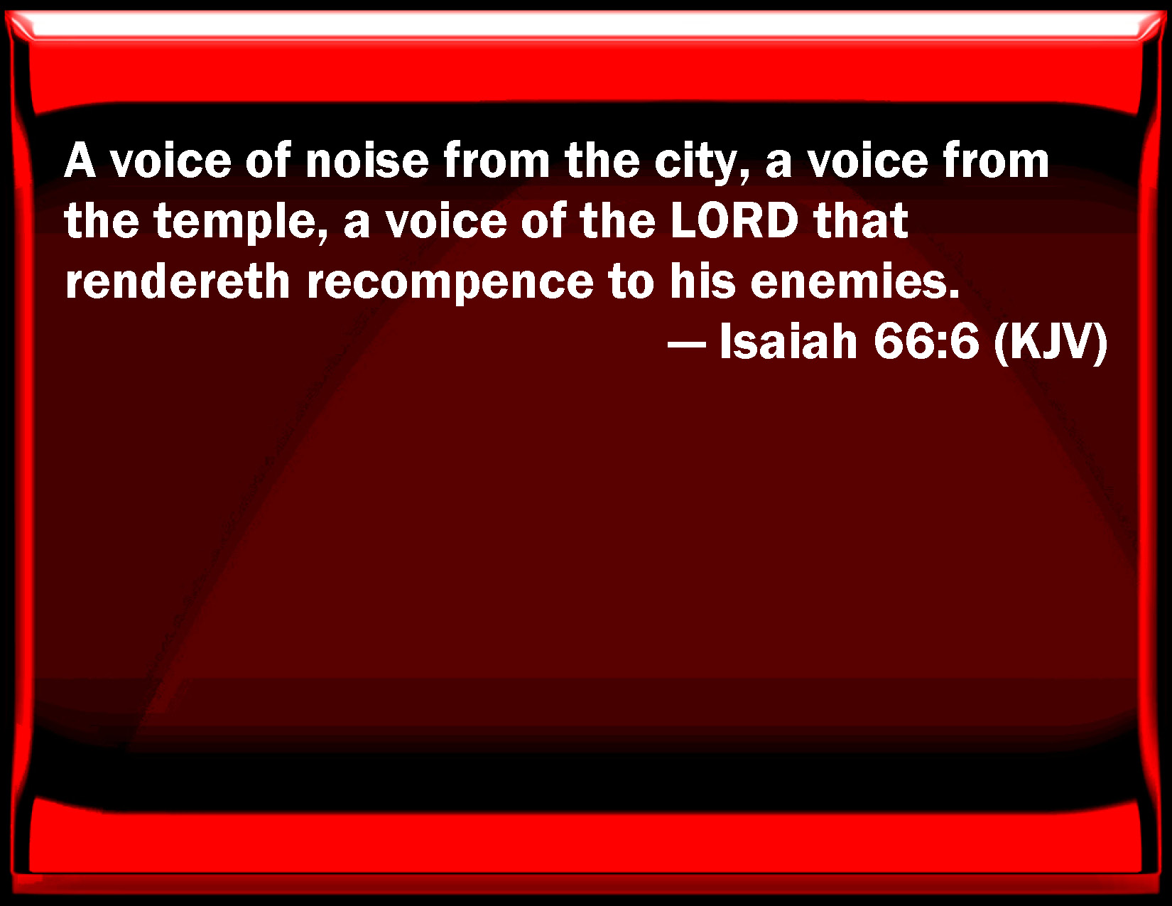 Bible Verse Slide Isaiah 66:6 A voice of noise from the city, a voice from the temple, a voice of the LORD that renders recompense to his enemies. KJV: A voice of noise from the city, a voice from the temple, a voice of the LORD that rendereth recompence to his enemies. DRB: A voice of the people from the city, a voice from the temple, the voice of the Lord that rendereth recompense to his enemies. DBT: A voice of tumult from the city, a voice from the temple, a voice of Jehovah that rendereth recompence to his enemies! ERV: A voice of tumult from the city, a voice from the temple, a voice of the LORD that rendereth recompence to his enemies. WBT: A voice of noise from the city, a voice from the temple, a voice of the LORD that rendereth recompense to his enemies. WEB: A voice of tumult from the city, a voice from the temple, a voice of Yahweh that renders recompense to his enemies. YLT: A voice of noise is from the city, a voice from the temple, The voice of Jehovah, giving recompence to His enemies.Links Isaiah 66:6 NIV • Isaiah 66:6 NLT • Isaiah 66:6 ESV • Isaiah 66:6 NASB • Isaiah 66:6 KJV • Isaiah 66:6 Interlinear • Isaiah 66:6 Commentaries • Isaiah 66:6 Parallel Texts • Isaiah 66:6 Bible Apps • Isaiah 66:6 Parallel • Bible Hub |