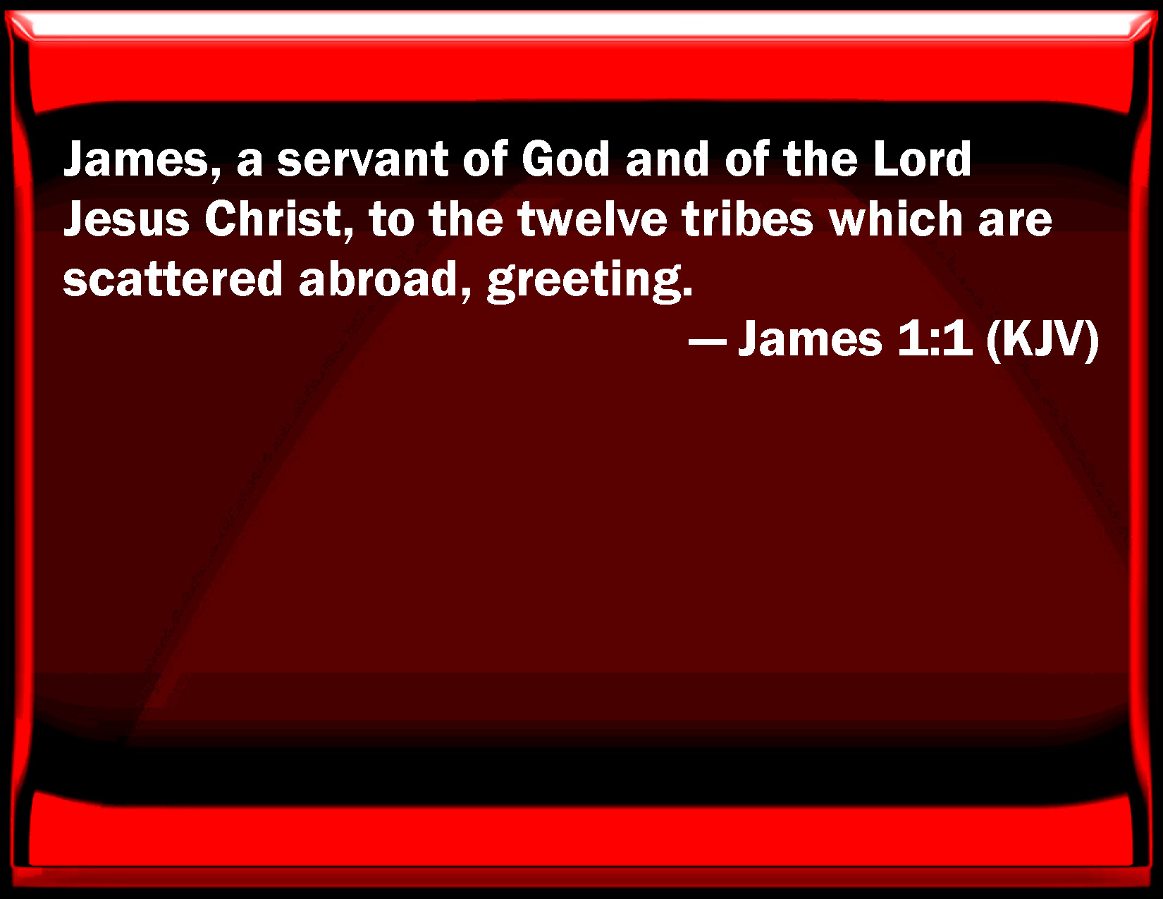Bible Verse Slide James 1:1 James, a servant of God and of the Lord Jesus Christ, to the twelve tribes which are scattered abroad, greeting. KJV: James, a servant of God and of the Lord Jesus Christ, to the twelve tribes which are scattered abroad, greeting. DRB: James the servant of God, and of our Lord Jesus Christ, to the twelve tribes which are scattered abroad, greeting. DBT: James, bondman of God and of the Lord Jesus Christ, to the twelve tribes which are in the dispersion, greeting. ERV: James, a servant of God and of the Lord Jesus Christ, to the twelve tribes which are of the Dispersion, greeting. WBT: James, a servant of God and of the Lord Jesus Christ, to the twelve tribes which are scattered abroad, greeting. WEB: James, a servant of God and of the Lord Jesus Christ, to the twelve tribes which are in the Dispersion: Greetings. YLT: James, of God and of the Lord Jesus Christ a servant, to the Twelve Tribes who are in the dispersion: Hail!Links James 1:1 NIV • James 1:1 NLT • James 1:1 ESV • James 1:1 NASB • James 1:1 KJV • James 1:1 Interlinear • James 1:1 Commentaries • James 1:1 Parallel Texts • James 1:1 Bible Apps • James 1:1 Parallel • Bible Hub |