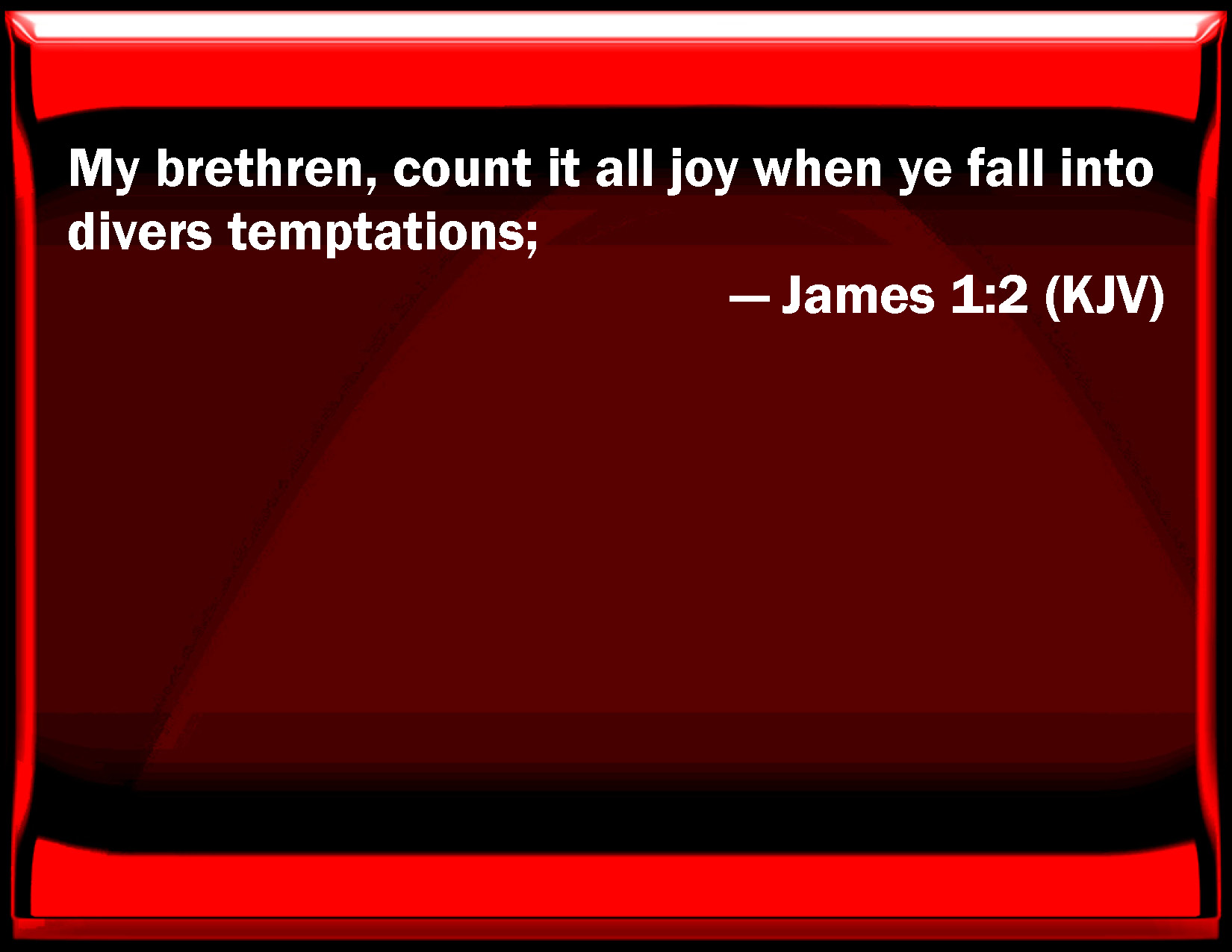 Bible Verse Slide James 1:2 My brothers, count it all joy when you fall into divers temptations; KJV: My brethren, count it all joy when ye fall into divers temptations; DRB: My brethren, count it all joy, when you shall fall into divers temptations; DBT: Count it all joy, my brethren, when ye fall into various temptations, ERV: Count it all joy, my brethren, when ye fall into manifold temptations; WBT: My brethren, count it all joy when ye fall into divers temptations. WEB: Count it all joy, my brothers, when you fall into various temptations, YLT: All joy count it, my brethren, when ye may fall into temptations manifold;Links James 1:2 NIV • James 1:2 NLT • James 1:2 ESV • James 1:2 NASB • James 1:2 KJV • James 1:2 Interlinear • James 1:2 Commentaries • James 1:2 Parallel Texts • James 1:2 Bible Apps • James 1:2 Parallel • Bible Hub |