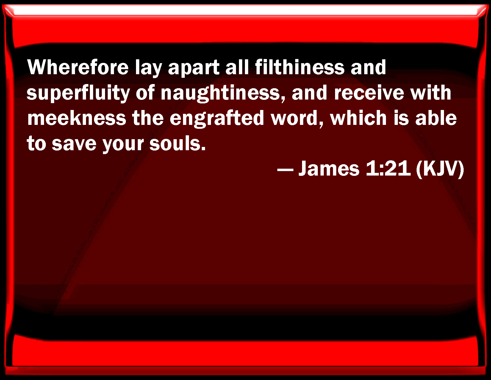 Bible Verse Slide James 1:21 Why lay apart all filthiness and superfluity of naughtiness, and receive with meekness the engrafted word, which is able to save your souls. KJV: Wherefore lay apart all filthiness and superfluity of naughtiness, and receive with meekness the engrafted word, which is able to save your souls. DRB: Wherefore casting away all uncleanness, and abundance of naughtiness, with meekness receive the ingrafted word, which is able to save your souls. DBT: Wherefore, laying aside all filthiness and abounding of wickedness, accept with meekness the implanted word, which is able to save your souls. ERV: Wherefore putting away all filthiness and overflowing of wickedness, receive with meekness the implanted word, which is able to save your souls. WBT: Wherefore lay apart all filthiness and superfluity of naughtiness, and receive with meekness the ingrafted word, which is able to save your souls. WEB: Therefore, putting away all filthiness and overflowing of wickedness, receive with humility the implanted word, which is able to save your souls. YLT: wherefore having put aside all filthiness and superabundance of evil, in meekness be receiving the engrafted word, that is able to save your souls;Links James 1:21 NIV • James 1:21 NLT • James 1:21 ESV • James 1:21 NASB • James 1:21 KJV • James 1:21 Interlinear • James 1:21 Commentaries • James 1:21 Parallel Texts • James 1:21 Bible Apps • James 1:21 Parallel • Bible Hub |