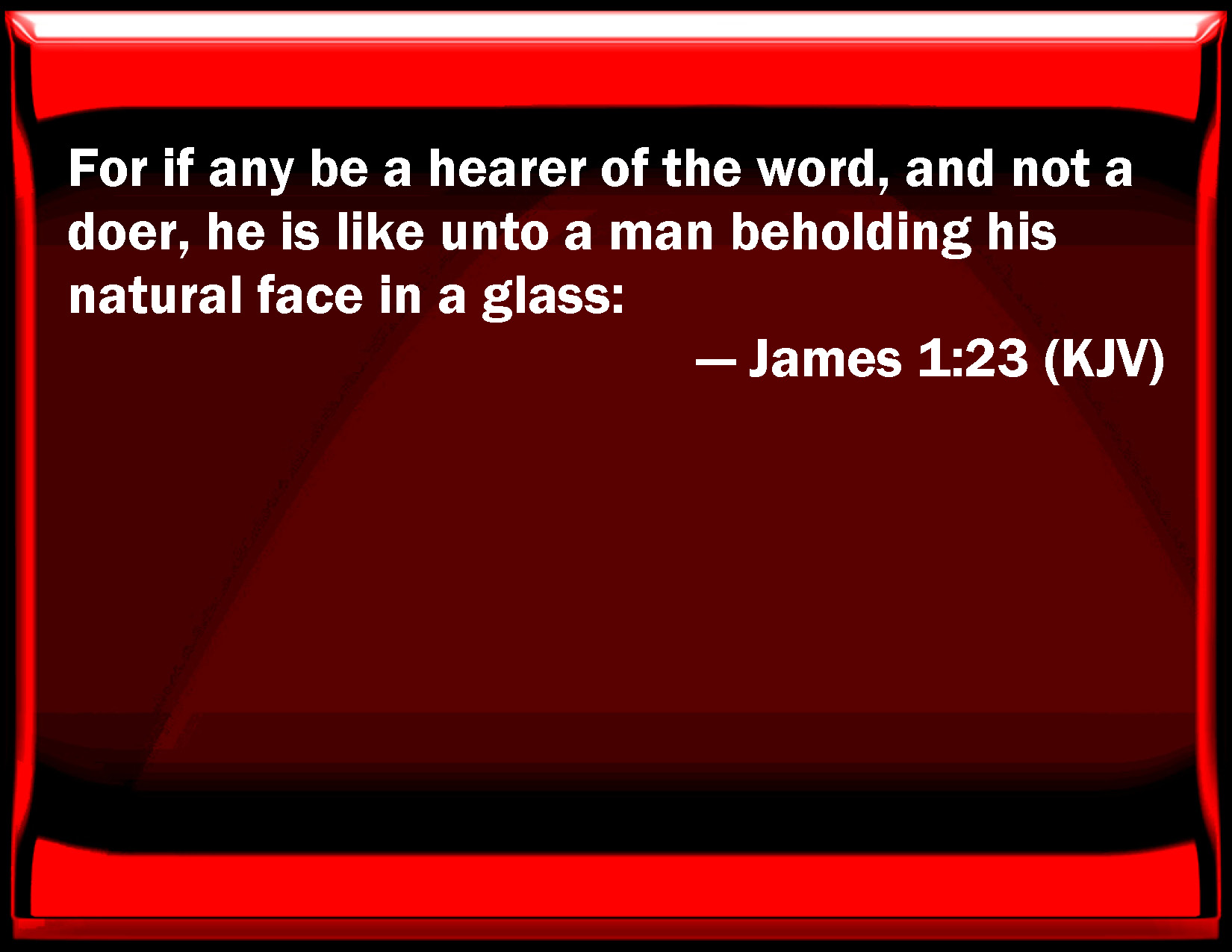Bible Verse Slide James 1:23 For if any be a hearer of the word, and not a doer, he is like to a man beholding his natural face in a glass: KJV: For if any be a hearer of the word, and not a doer, he is like unto a man beholding his natural face in a glass: DRB: For if a man be a hearer of the word, and not a doer, he shall be compared to a man beholding his own countenance in a glass. DBT: For if any man be a hearer of the word and not a doer, he is like to a man considering his natural face in a mirror: ERV: For if any one is a hearer of the word, and not a doer, he is like unto a man beholding his natural face in a mirror: WBT: For if any is a hearer of the word, and not a doer, he is like a man beholding his natural face in a glass: WEB: For if anyone is a hearer of the word and not a doer, he is like a man looking at his natural face in a mirror; YLT: because, if any one is a hearer of the word and not a doer, this one hath been like to a man viewing his natural face in a mirror,Links James 1:23 NIV • James 1:23 NLT • James 1:23 ESV • James 1:23 NASB • James 1:23 KJV • James 1:23 Interlinear • James 1:23 Commentaries • James 1:23 Parallel Texts • James 1:23 Bible Apps • James 1:23 Parallel • Bible Hub |