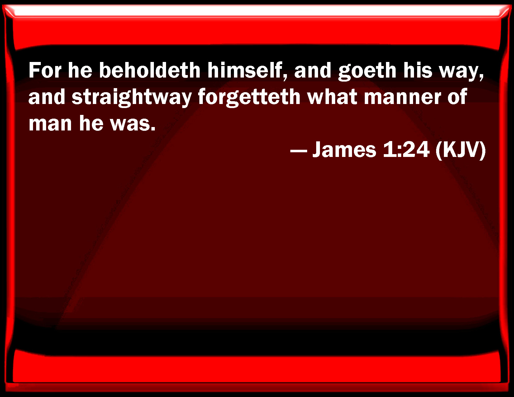 Bible Verse Slide James 1:24 For he beholds himself, and goes his way, and straightway forgets what manner of man he was. KJV: For he beholdeth himself, and goeth his way, and straightway forgetteth what manner of man he was. DRB: For he beheld himself, and went his way, and presently forgot what manner of man he was. DBT: for he has considered himself and is gone away, and straightway he has forgotten what he was like. ERV: for he beholdeth himself, and goeth away, and straightway forgetteth what manner of man he was. WBT: For he beholdeth himself, and goeth away, and immediately forgetteth what manner of man he was. WEB: for he sees himself, and goes away, and immediately forgets what kind of man he was. YLT: for he did view himself, and hath gone away, and immediately he did forget of what kind he was;Links James 1:24 NIV • James 1:24 NLT • James 1:24 ESV • James 1:24 NASB • James 1:24 KJV • James 1:24 Interlinear • James 1:24 Commentaries • James 1:24 Parallel Texts • James 1:24 Bible Apps • James 1:24 Parallel • Bible Hub |