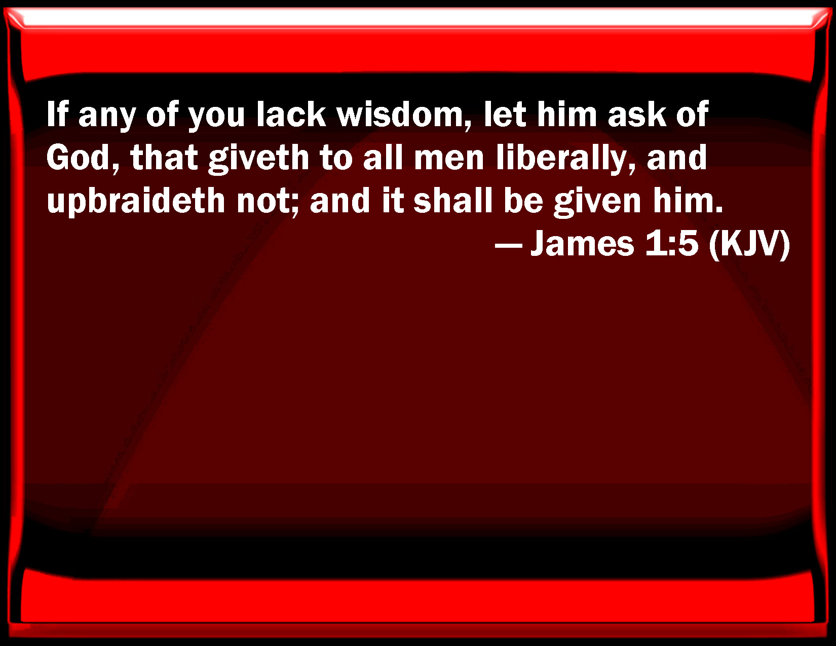 Bible Verse Slide James 1:5 If any of you lack wisdom, let him ask of God, that gives to all men liberally, and upbraides not; and it shall be given him. KJV: If any of you lack wisdom, let him ask of God, that giveth to all men liberally, and upbraideth not; and it shall be given him. DRB: But if any of you want wisdom, let him ask of God, who giveth to all men abundantly, and upbraideth not; and it shall be given him. DBT: But if any one of you lack wisdom, let him ask of God, who gives to all freely and reproaches not, and it shall be given to him: ERV: But if any of you lacketh wisdom, let him ask of God, who giveth to all liberally and upbraideth not; and it shall be given him. WBT: If any of you lacketh wisdom, let him ask of God, who giveth to all men liberally, and upbraideth not; and it shall be given to him. WEB: But if any of you lacks wisdom, let him ask of God, who gives to all liberally and without reproach; and it will be given to him. YLT: and if any of you do lack wisdom, let him ask from God, who is giving to all liberally, and not reproaching, and it shall be given to him;Links James 1:5 NIV • James 1:5 NLT • James 1:5 ESV • James 1:5 NASB • James 1:5 KJV • James 1:5 Interlinear • James 1:5 Commentaries • James 1:5 Parallel Texts • James 1:5 Bible Apps • James 1:5 Parallel • Bible Hub |