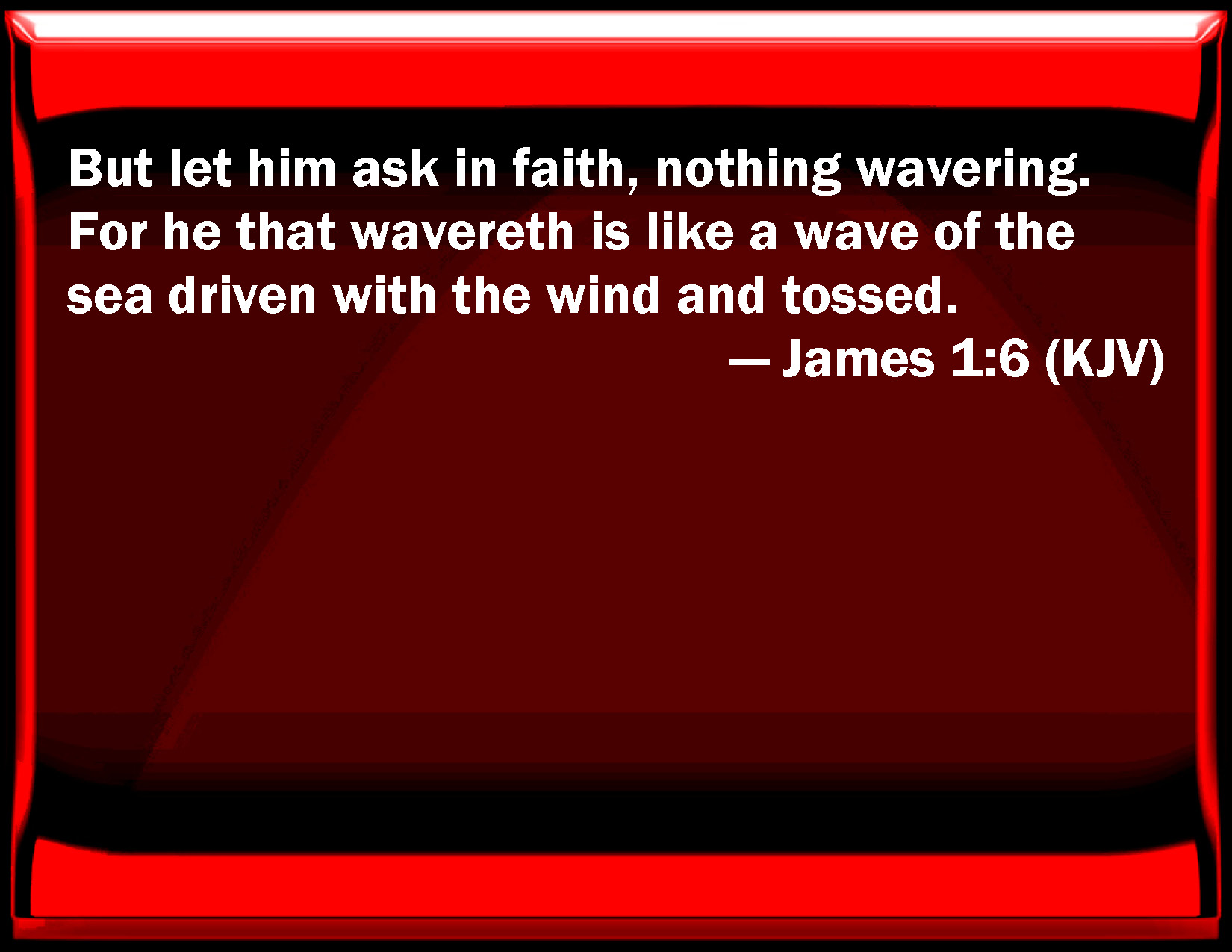 Bible Verse Slide James 1:6 But let him ask in faith, nothing wavering. For he that wavers is like a wave of the sea driven with the wind and tossed. KJV: But let him ask in faith, nothing wavering. For he that wavereth is like a wave of the sea driven with the wind and tossed. DRB: But let him ask in faith, nothing wavering. For he that wavereth is like a wave of the sea, which is moved and carried about by the wind. DBT: but let him ask in faith, nothing doubting. For he that doubts is like a wave of the sea driven by the wind and tossed about; ERV: But let him ask in faith, nothing doubting: for he that doubteth is like the surge of the sea driven by the wind and tossed. WBT: But let him ask in faith, nothing wavering. For he that wavereth is like a wave of the sea driven with the wind and tossed. WEB: But let him ask in faith, without any doubting, for he who doubts is like a wave of the sea, driven by the wind and tossed. YLT: and let him ask in faith, nothing doubting, for he who is doubting hath been like a wave of the sea, driven by wind and tossed,Links James 1:6 NIV • James 1:6 NLT • James 1:6 ESV • James 1:6 NASB • James 1:6 KJV • James 1:6 Interlinear • James 1:6 Commentaries • James 1:6 Parallel Texts • James 1:6 Bible Apps • James 1:6 Parallel • Bible Hub |