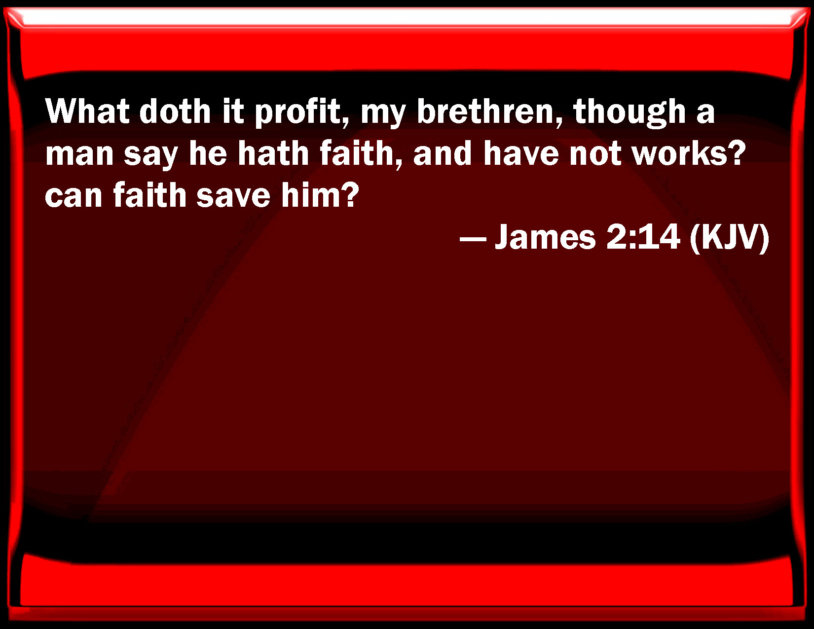 Bible Verse Slide James 2:14 What does it profit, my brothers, though a man say he has faith, and have not works? can faith save him? KJV: What doth it profit, my brethren, though a man say he hath faith, and have not works? can faith save him? DRB: What shall it profit, my brethren, if a man say he hath faith, but hath not works? Shall faith be able to save him? DBT: What is the profit, my brethren, if any one say he have faith, but have not works? can faith save him? ERV: What doth it profit, my brethren, if a man say he hath faith, but have not works? can that faith save him? WBT: What doth it profit, my brethren, though a man sayeth he hath faith, and hath not works? can faith save him? WEB: What good is it, my brothers, if a man says he has faith, but has no works? Can faith save him? YLT: What is the profit, my brethren, if faith, any one may speak of having, and works he may not have? is that faith able to save him?Links James 2:14 NIV • James 2:14 NLT • James 2:14 ESV • James 2:14 NASB • James 2:14 KJV • James 2:14 Interlinear • James 2:14 Commentaries • James 2:14 Parallel Texts • James 2:14 Bible Apps • James 2:14 Parallel • Bible Hub |