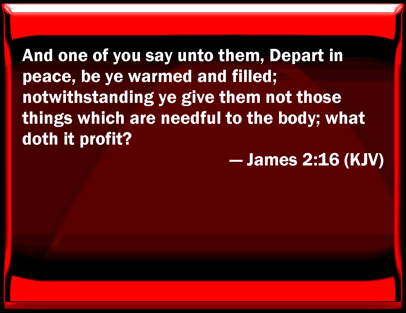 Bible Verse Slide James 2:16 And one of you say to them, Depart in peace, be you warmed and filled; notwithstanding you give them not those things which are needful to the body; what does it profit? KJV: And one of you say unto them, Depart in peace, be ye warmed and filled; notwithstanding ye give them not those things which are needful to the body; what doth it profit? DRB: And one of you say to them: Go in peace, be ye warmed and filled; yet give them not those things that are necessary for the body, what shall it profit? DBT: and one from amongst you say to them, Go in peace, be warmed and filled; but give not to them the needful things for the body, what is the profit? ERV: and one of you say unto them, Go in peace, be ye warmed and filled; and yet ye give them not the things needful to the body; what doth it profit? WBT: And one of you sayeth to them, Depart in peace, be you warmed and filled; notwithstanding ye give them not those things which are needful to the body; what doth it profit? WEB: and one of you tells them, "Go in peace, be warmed and filled;" and yet you didn't give them the things the body needs, what good is it? YLT: and any one of you may say to them, 'Depart ye in peace, be warmed, and be filled,' and may not give to them the things needful for the body, what is the profit?Links James 2:16 NIV • James 2:16 NLT • James 2:16 ESV • James 2:16 NASB • James 2:16 KJV • James 2:16 Interlinear • James 2:16 Commentaries • James 2:16 Parallel Texts • James 2:16 Bible Apps • James 2:16 Parallel • Bible Hub |