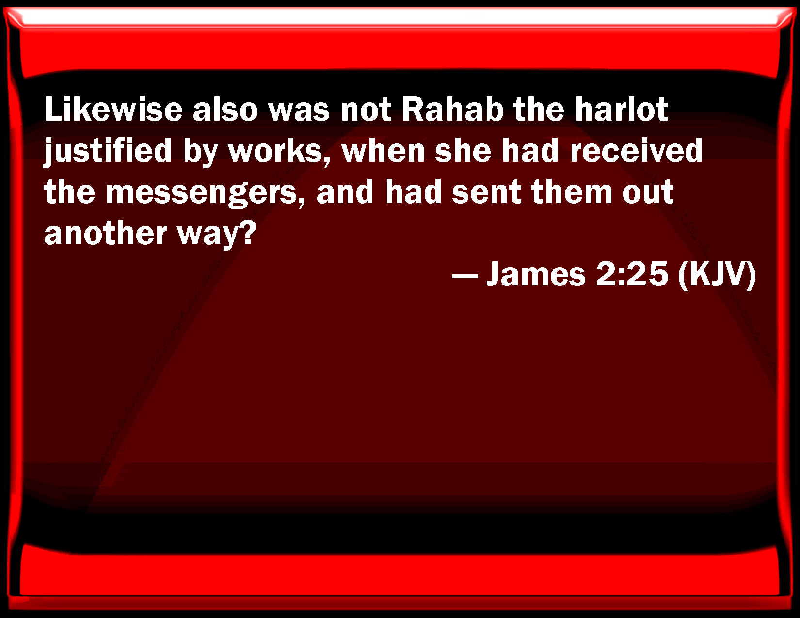 Bible Verse Slide James 2:25 Likewise also was not Rahab the harlot justified by works, when she had received the messengers, and had sent them out another way? KJV: Likewise also was not Rahab the harlot justified by works, when she had received the messengers, and had sent them out another way? DRB: And in like manner also Rahab the harlot, was not she justified by works, receiving the messengers, and sending them out another way? DBT: But was not in like manner also Rahab the harlot justified on the principle of works, when she had received the messengers and put them forth by another way? ERV: And in like manner was not also Rahab the harlot justified by works, in that she received the messengers, and sent them out another way? WBT: Likewise also was not Rahab the harlot justified by works, when she had received the messengers, and had sent them out another way? WEB: In the same way, wasn't Rahab the prostitute also justified by works, in that she received the messengers, and sent them out another way? YLT: and in like manner also Rahab the harlot — was she not out of works declared righteous, having received the messengers, and by another way having sent forth?Links James 2:25 NIV • James 2:25 NLT • James 2:25 ESV • James 2:25 NASB • James 2:25 KJV • James 2:25 Interlinear • James 2:25 Commentaries • James 2:25 Parallel Texts • James 2:25 Bible Apps • James 2:25 Parallel • Bible Hub |