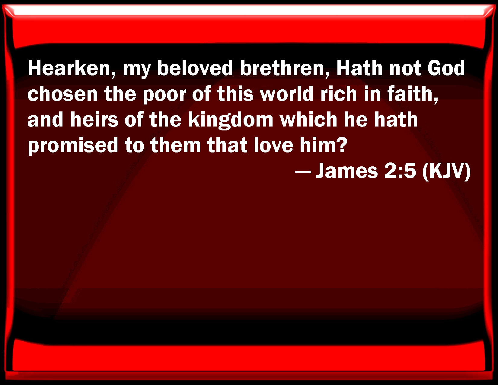 Bible Verse Slide James 2:5 Listen, my beloved brothers, Has not God chosen the poor of this world rich in faith, and heirs of the kingdom which he has promised to them that love him? KJV: Hearken, my beloved brethren, Hath not God chosen the poor of this world rich in faith, and heirs of the kingdom which he hath promised to them that love him? DRB: Hearken, my dearest brethren: hath not God chosen the poor in this world, rich in faith, and heirs of the kingdom which God hath promised to them that love him? DBT: Hear, my beloved brethren: Has not God chosen the poor as to the world, rich in faith, and heirs of the kingdom, which he has promised to them that love him? ERV: Hearken, my beloved brethren; did not God choose them that are poor as to the world to be rich in faith, and heirs of the kingdom which he promised to them that love him? WBT: Hearken, my beloved brethren, Hath not God chosen the poor of this world rich in faith, and heirs of the kingdom which he hath promised to them that love him? WEB: Listen, my beloved brothers. Didn't God choose those who are poor in this world to be rich in faith, and heirs of the Kingdom which he promised to those who love him? YLT: Hearken, my brethren beloved, did not God choose the poor of this world, rich in faith, and heirs of the reign that He promised to those loving Him?Links James 2:5 NIV • James 2:5 NLT • James 2:5 ESV • James 2:5 NASB • James 2:5 KJV • James 2:5 Interlinear • James 2:5 Commentaries • James 2:5 Parallel Texts • James 2:5 Bible Apps • James 2:5 Parallel • Bible Hub |