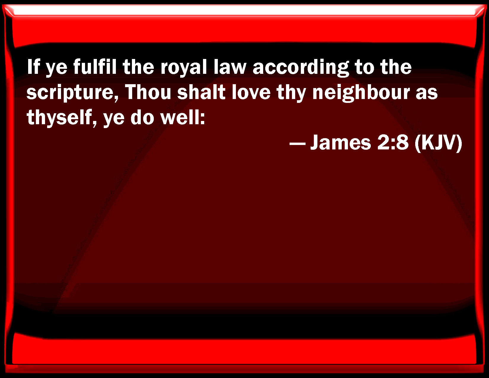 Bible Verse Slide James 2:8 If you fulfill the royal law according to the scripture, You shall love your neighbor as yourself, you do well: KJV: If ye fulfil the royal law according to the scripture, Thou shalt love thy neighbour as thyself, ye do well: DRB: If then you fulfil the royal law, according to the scriptures, Thou shalt love thy neighbour as thyself; you do well. DBT: If indeed ye keep the royal law according to the scripture, Thou shalt love thy neighbour as thyself, ye do well. ERV: Howbeit if ye fulfill the royal law, according to the scripture, Thou shalt love thy neighbour as thyself, ye do well: WBT: If ye fulfill the royal law according to the scripture, Thou shalt love thy neighbor as thyself, ye do well: WEB: However, if you fulfill the royal law, according to the Scripture, "You shall love your neighbor as yourself," you do well. YLT: If, indeed, royal law ye complete, according to the Writing, 'Thou shalt love thy neighbour as thyself,' — ye do well;Links James 2:8 NIV • James 2:8 NLT • James 2:8 ESV • James 2:8 NASB • James 2:8 KJV • James 2:8 Interlinear • James 2:8 Commentaries • James 2:8 Parallel Texts • James 2:8 Bible Apps • James 2:8 Parallel • Bible Hub |