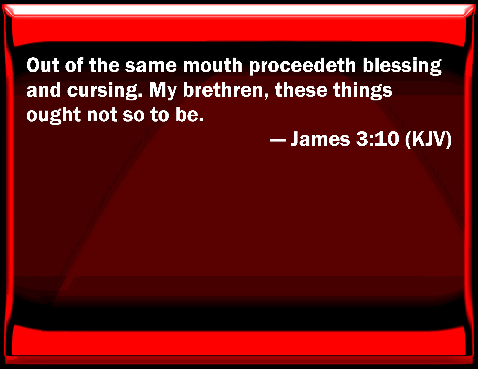 Bible Verse Slide James 3:10 Out of the same mouth proceeds blessing and cursing. My brothers, these things ought not so to be. KJV: Out of the same mouth proceedeth blessing and cursing. My brethren, these things ought not so to be. DRB: Out of the same mouth proceedeth blessing and cursing. My brethren, these things ought not so to be. DBT: Out of the same mouth goes forth blessing and cursing. It is not right, my brethren, that these things should be thus. ERV: out of the same mouth cometh forth blessing and cursing. My brethren, these things ought not so to be. WBT: Out of the same mouth proceedeth blessing and cursing. My brethren, these things ought not so to be. WEB: Out of the same mouth comes forth blessing and cursing. My brothers, these things ought not to be so. YLT: out of the same mouth doth come forth blessing and cursing; it doth not need, my brethren, these things so to happen;Links James 3:10 NIV • James 3:10 NLT • James 3:10 ESV • James 3:10 NASB • James 3:10 KJV • James 3:10 Interlinear • James 3:10 Commentaries • James 3:10 Parallel Texts • James 3:10 Bible Apps • James 3:10 Parallel • Bible Hub |