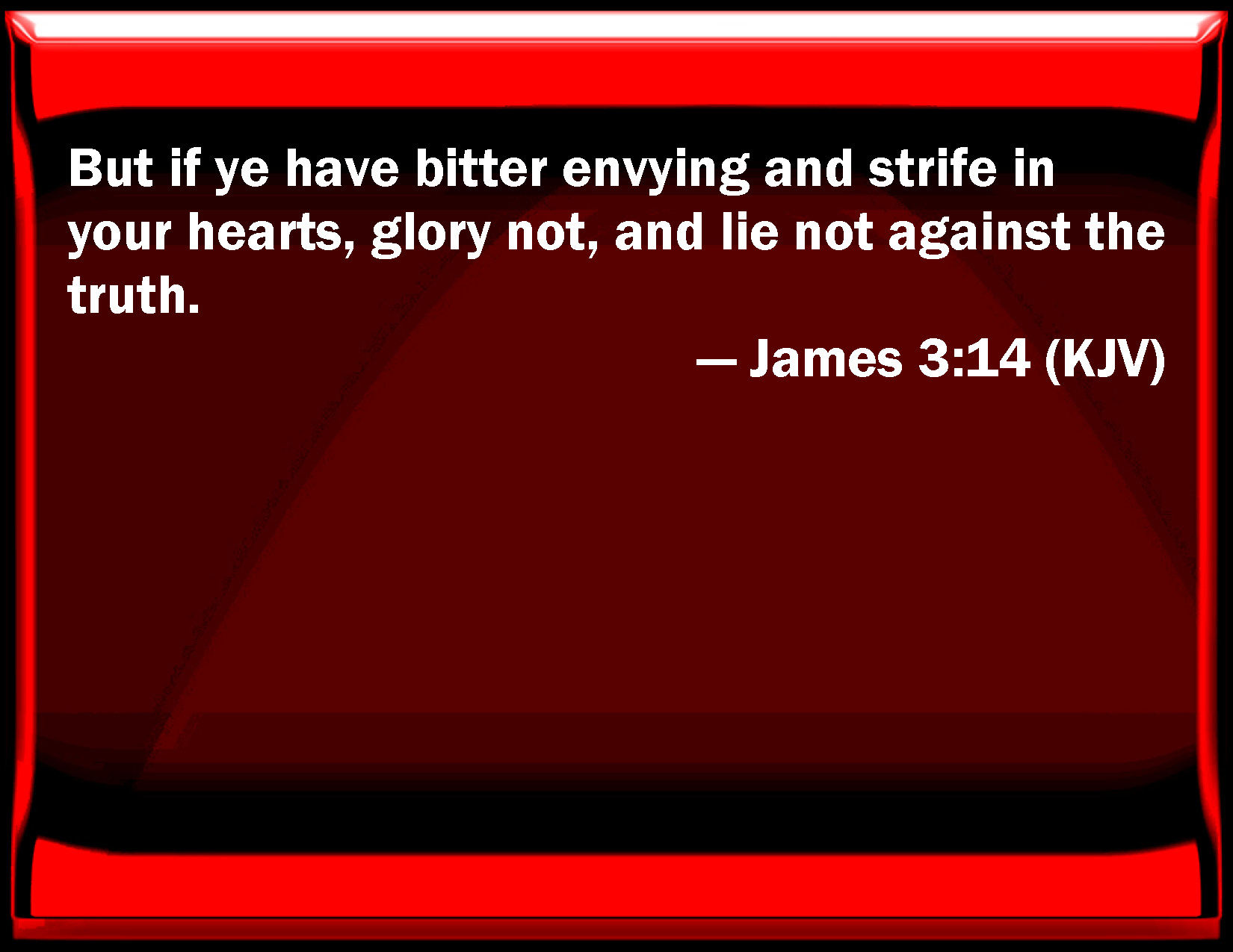 Bible Verse Slide James 3:14 But if you have bitter envying and strife in your hearts, glory not, and lie not against the truth. KJV: But if ye have bitter envying and strife in your hearts, glory not, and lie not against the truth. DRB: But if you have bitter zeal, and there be contentions in your hearts; glory not, and be not liars against the truth. DBT: but if ye have bitter emulation and strife in your hearts, do not boast and lie against the truth. ERV: But if ye have bitter jealousy and faction in your heart, glory not and lie not against the truth. WBT: But if ye have bitter envying and strife in your hearts, glory not, and lie not against the truth. WEB: But if you have bitter jealousy and selfish ambition in your heart, don't boast and don't lie against the truth. YLT: and if bitter zeal ye have, and rivalry in your heart, glory not, nor lie against the truth;Links James 3:14 NIV • James 3:14 NLT • James 3:14 ESV • James 3:14 NASB • James 3:14 KJV • James 3:14 Interlinear • James 3:14 Commentaries • James 3:14 Parallel Texts • James 3:14 Bible Apps • James 3:14 Parallel • Bible Hub |