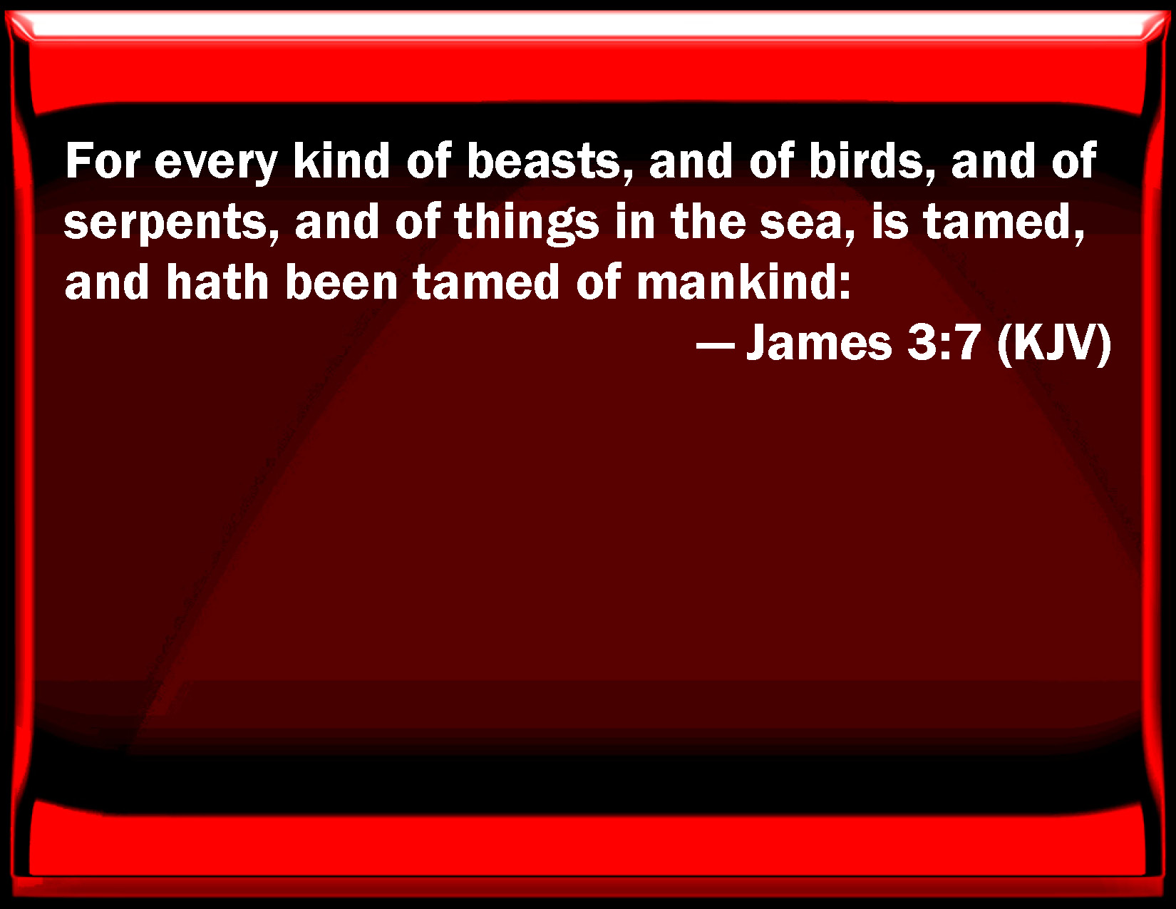 Bible Verse Slide James 3:7 For every kind of beasts, and of birds, and of serpents, and of things in the sea, is tamed, and has been tamed of mankind: KJV: For every kind of beasts, and of birds, and of serpents, and of things in the sea, is tamed, and hath been tamed of mankind: DRB: For every nature of beasts, and of birds, and of serpents, and of the rest, is tamed, and hath been tamed, by the nature of man: DBT: For every species both of beasts and of birds, both of creeping things and of sea animals, is tamed and has been tamed by the human species; ERV: For every kind of beasts and birds, of creeping things and things in the sea, is tamed, and hath been tamed by mankind: WBT: For every kind of beasts, and of birds, and of serpents, and of animals in the sea, is tamed, and hath been tamed by mankind: WEB: For every kind of animal, bird, creeping thing, and thing in the sea, is tamed, and has been tamed by mankind. YLT: For every nature, both of beasts and of fowls, both of creeping things and things of the sea, is subdued, and hath been subdued, by the human nature,Links James 3:7 NIV • James 3:7 NLT • James 3:7 ESV • James 3:7 NASB • James 3:7 KJV • James 3:7 Interlinear • James 3:7 Commentaries • James 3:7 Parallel Texts • James 3:7 Bible Apps • James 3:7 Parallel • Bible Hub |