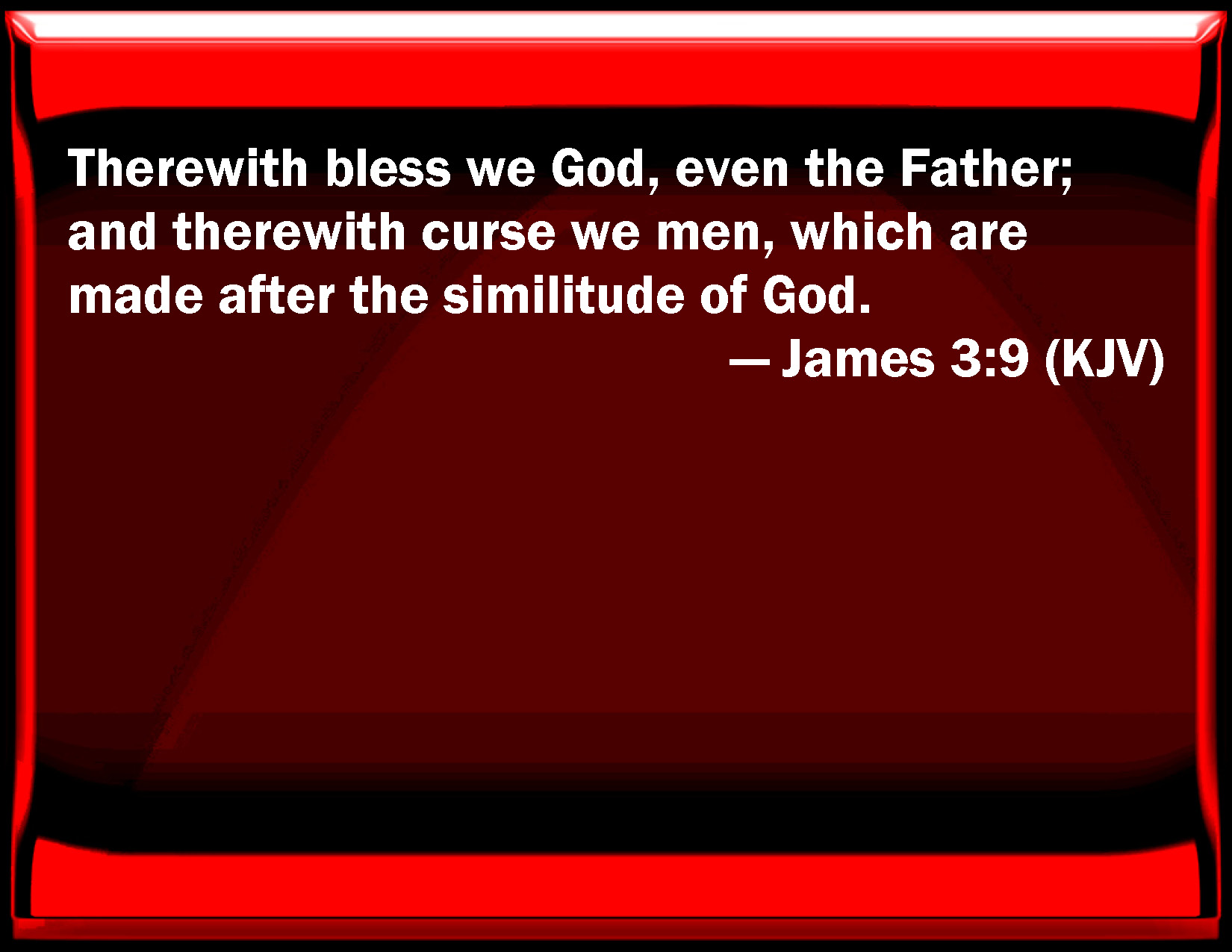 Bible Verse Slide James 3:9 Therewith bless we God, even the Father; and therewith curse we men, which are made after the similitude of God. KJV: Therewith bless we God, even the Father; and therewith curse we men, which are made after the similitude of God. DRB: By it we bless God and the Father: and by it we curse men, who are made after the likeness of God. DBT: Therewith bless we the Lord and Father, and therewith curse we men made after the likeness of God. ERV: Therewith bless we the Lord and Father; and therewith curse we men, which are made after the likeness of God: WBT: With this we bless God, even the Father; and with this we curse men, who are made after the similitude of God. WEB: With it we bless our God and Father, and with it we curse men, who are made in the image of God. YLT: with it we do bless the God and Father, and with it we do curse the men made according to the similitude of God;Links James 3:9 NIV • James 3:9 NLT • James 3:9 ESV • James 3:9 NASB • James 3:9 KJV • James 3:9 Interlinear • James 3:9 Commentaries • James 3:9 Parallel Texts • James 3:9 Bible Apps • James 3:9 Parallel • Bible Hub |