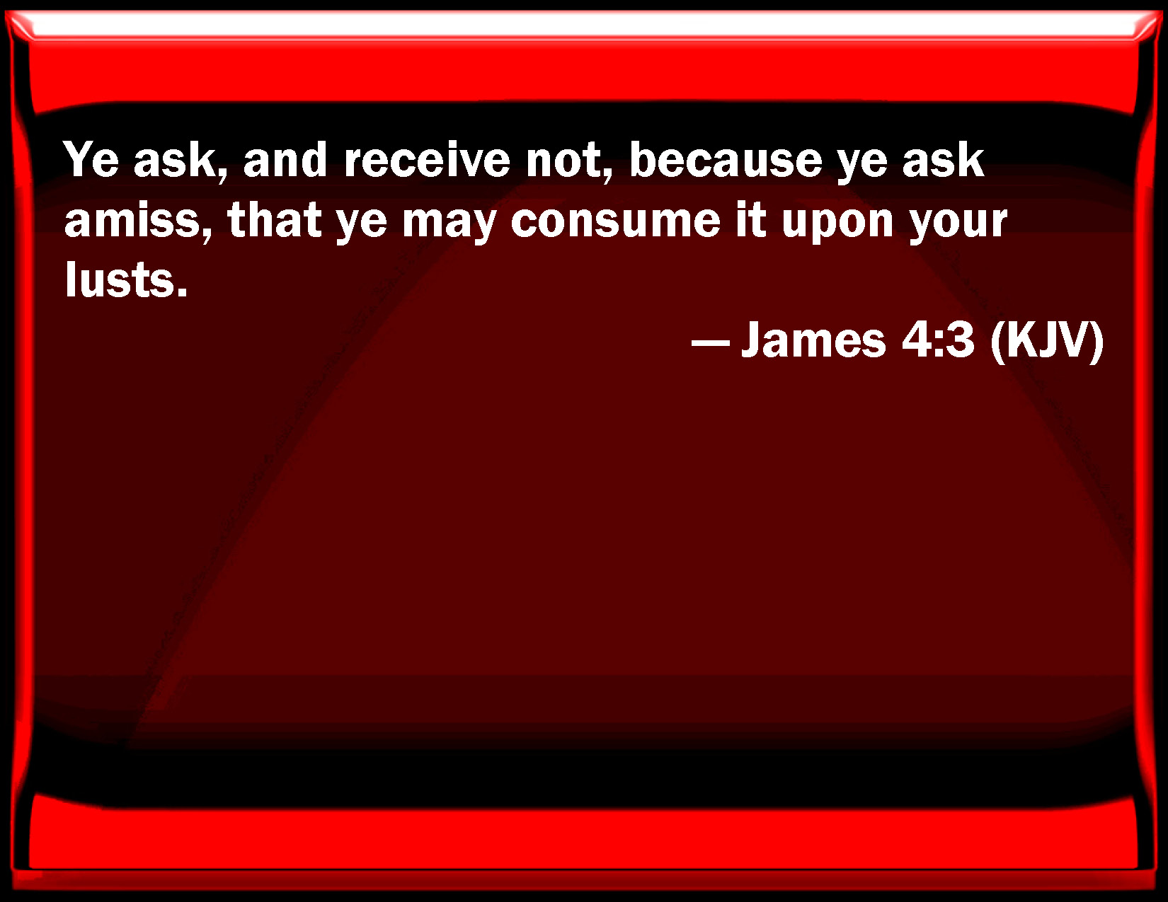 Bible Verse Slide James 4:3 You ask, and receive not, because you ask amiss, that you may consume it on your lusts. KJV: Ye ask, and receive not, because ye ask amiss, that ye may consume it upon your lusts. DRB: You ask, and receive not; because you ask amiss: that you may consume it on your concupiscences. DBT: Ye ask and receive not, because ye ask evilly, that ye may consume it in your pleasures. ERV: Ye ask, and receive not, because ye ask amiss, that ye may spend it in your pleasures. WBT: Ye ask, and receive not, because ye ask amiss, that ye may consume it upon your lusts. WEB: You ask, and don't receive, because you ask with wrong motives, so that you may spend it for your pleasures. YLT: ye ask, and ye receive not, because evilly ye ask, that in your pleasures ye may spend it.Links James 4:3 NIV • James 4:3 NLT • James 4:3 ESV • James 4:3 NASB • James 4:3 KJV • James 4:3 Interlinear • James 4:3 Commentaries • James 4:3 Parallel Texts • James 4:3 Bible Apps • James 4:3 Parallel • Bible Hub |