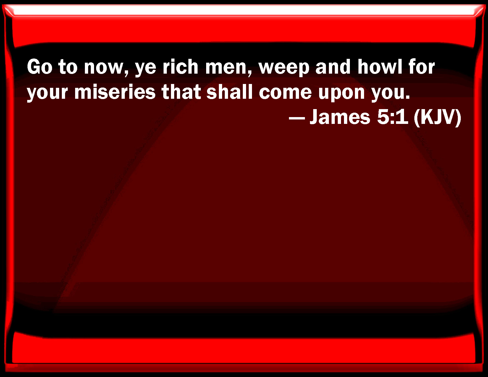 Bible Verse Slide James 5:1 Go to now, you rich men, weep and howl for your miseries that shall come on you. KJV: Go to now, ye rich men, weep and howl for your miseries that shall come upon you. DRB: Go to now, ye rich men, weep and howl in your miseries, which shall come upon you. DBT: Go to now, ye rich, weep, howling over your miseries that are coming upon you. ERV: Go to now, ye rich, weep and howl for your miseries that are coming upon you. WBT: Come now, ye rich men, weep and howl for your miseries that shall come upon you. WEB: Come now, you rich, weep and howl for your miseries that are coming on you. YLT: Go, now, ye rich! weep, howling over your miseries that are coming upon you;Links James 5:1 NIV • James 5:1 NLT • James 5:1 ESV • James 5:1 NASB • James 5:1 KJV • James 5:1 Interlinear • James 5:1 Commentaries • James 5:1 Parallel Texts • James 5:1 Bible Apps • James 5:1 Parallel • Bible Hub |