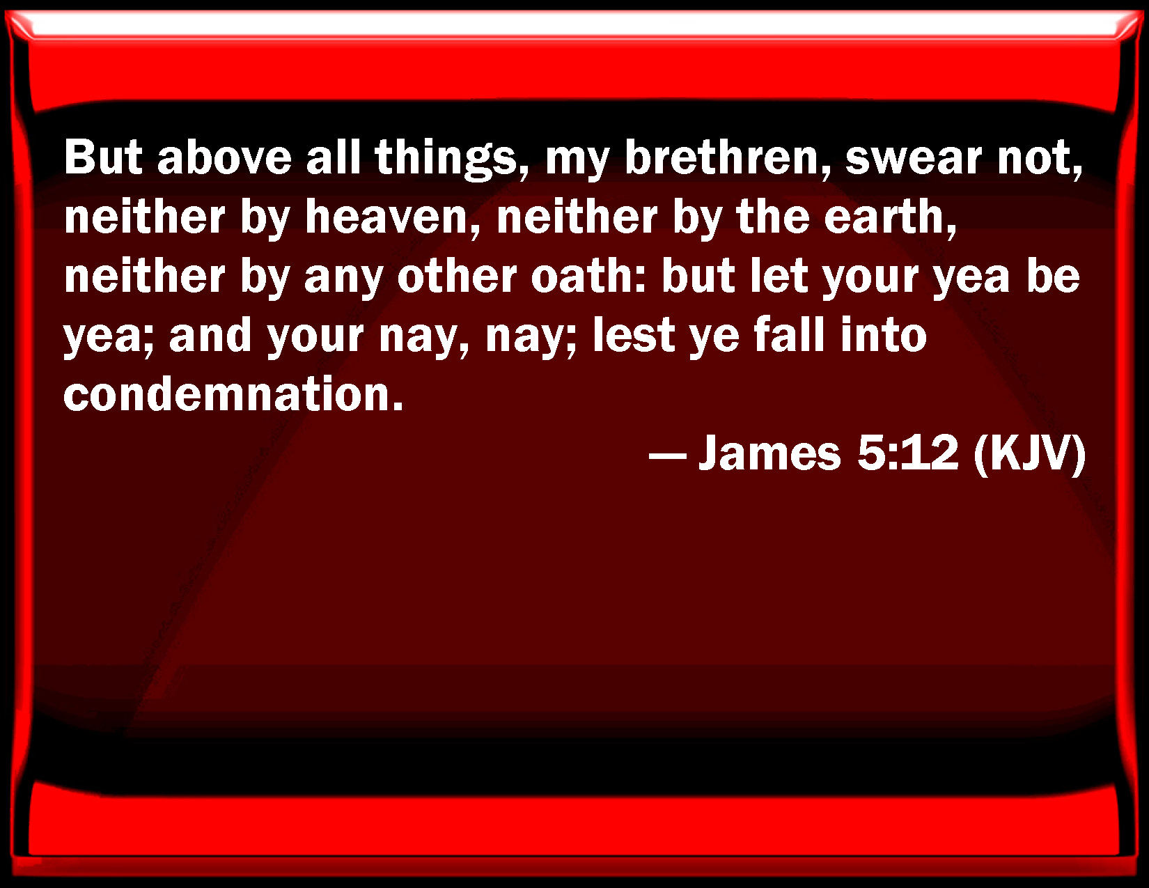 Bible Verse Slide James 5:12 But above all things, my brothers, swear not, neither by heaven, neither by the earth, neither by any other oath: but let your yes be yes; and your no, no; lest you fall into condemnation. KJV: But above all things, my brethren, swear not, neither by heaven, neither by the earth, neither by any other oath: but let your yea be yea; and your nay, nay; lest ye fall into condemnation. DRB: But above all things, my brethren, swear not, neither by heaven, nor by the earth, nor by any other oath. But let your speech be, yea, yea: no, no: that you fall not under judgment. DBT: But before all things, my brethren, swear not, neither by heaven, nor by the earth, nor by any other oath; but let your yea be yea, and your nay, nay, that ye do not fall under judgment. ERV: But above all things, my brethren, swear not, neither by the heaven, nor by the earth, nor by any other oath: but let your yea be yea, and your nay, nay; that ye fall not under judgment. WBT: But above all things, my brethren, swear not, neither by heaven, neither by the earth, neither by any other oath: but let your yea, be yea: and your nay, nay; lest ye fall into condemnation. WEB: But above all things, my brothers, don't swear, neither by heaven, nor by the earth, nor by any other oath; but let your "yes" be "yes," and your "no," "no;" so that you don't fall into hypocrisy. YLT: And before all things, my brethren, do not swear, neither by the heaven, neither by the earth, neither by any other oath, and let your Yes be Yes, and the No, No; that under judgment ye may not fall.Links James 5:12 NIV • James 5:12 NLT • James 5:12 ESV • James 5:12 NASB • James 5:12 KJV • James 5:12 Interlinear • James 5:12 Commentaries • James 5:12 Parallel Texts • James 5:12 Bible Apps • James 5:12 Parallel • Bible Hub |