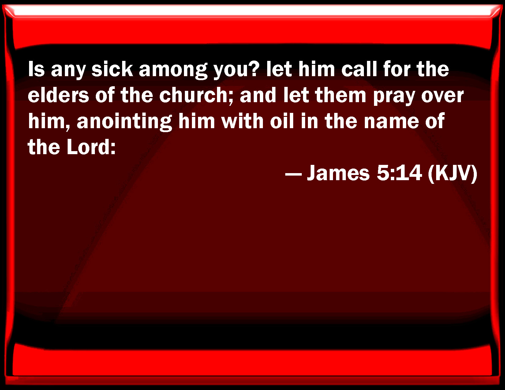 Bible Verse Slide James 5:14 Is any sick among you? let him call for the elders of the church; and let them pray over him, anointing him with oil in the name of the Lord: KJV: Is any sick among you? let him call for the elders of the church; and let them pray over him, anointing him with oil in the name of the Lord: DRB: Is any man sick among you? Let him bring in the priests of the church, and let them pray over him, anointing him with oil in the name of the Lord. DBT: Is any sick among you? let him call to him the elders of the assembly, and let them pray over him, anointing him with oil in the name of the Lord; ERV: Is any among you sick? let him call for the elders of the church; and let them pray over him, anointing him with oil in the name of the Lord: WBT: Is any sick among you? let him call for the elders of the church; and let them pray over him, anointing him with oil in the name of the Lord: WEB: Is any among you sick? Let him call for the elders of the assembly, and let them pray over him, anointing him with oil in the name of the Lord, YLT: is any infirm among you? let him call for the elders of the assembly, and let them pray over him, having anointed him with oil, in the name of the Lord,Links James 5:14 NIV • James 5:14 NLT • James 5:14 ESV • James 5:14 NASB • James 5:14 KJV • James 5:14 Interlinear • James 5:14 Commentaries • James 5:14 Parallel Texts • James 5:14 Bible Apps • James 5:14 Parallel • Bible Hub |